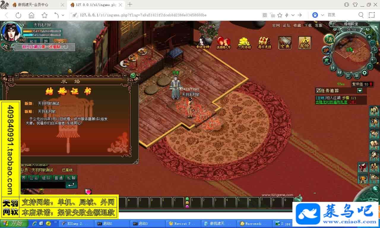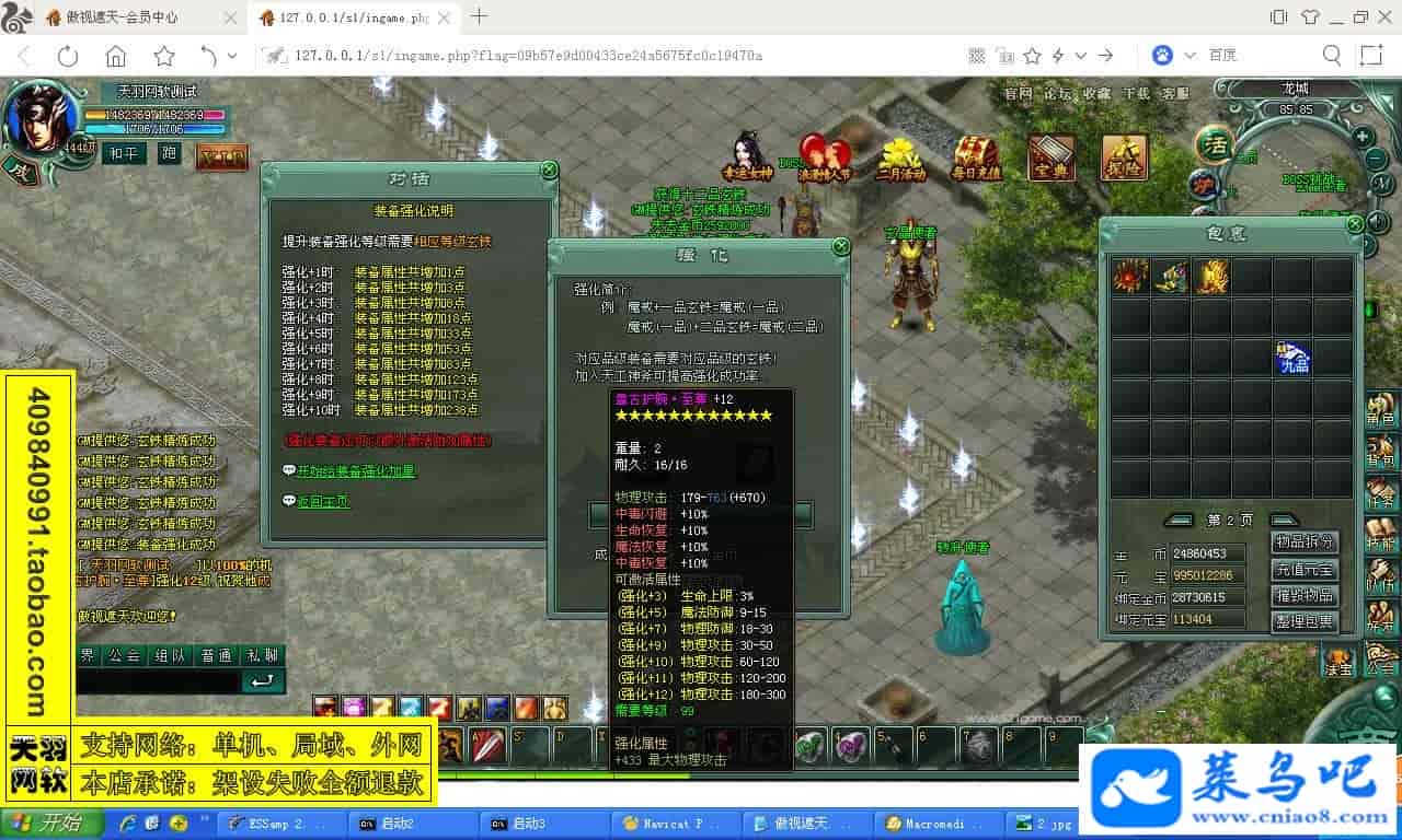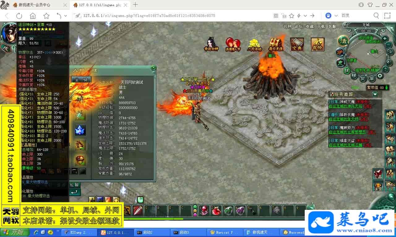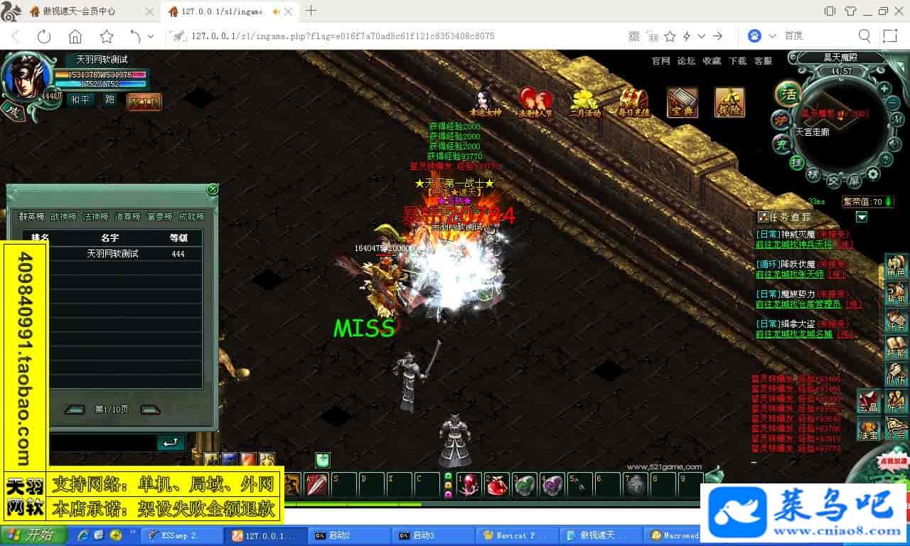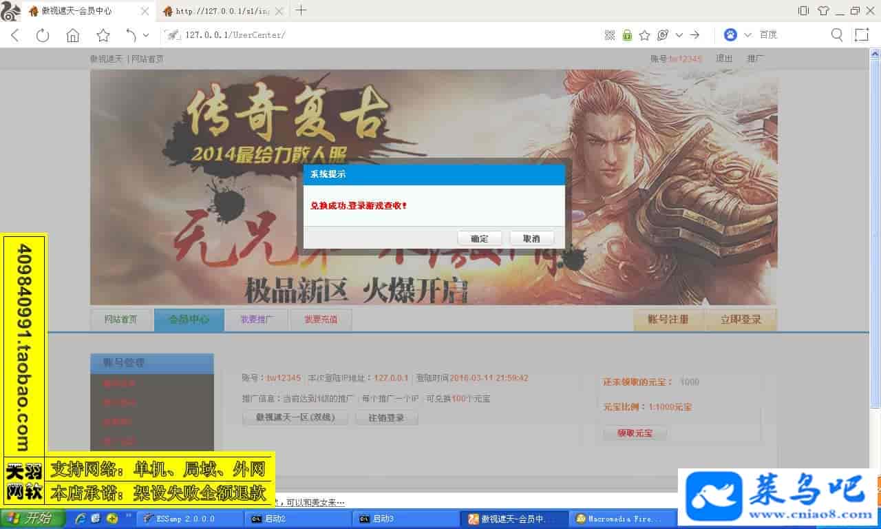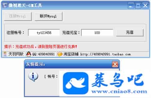 游戏名称:傲视遮天测试状态:单机、局域、外网 ( 架设外网仅支持独立服务器+IP )支持系统:服务端架设系统win2003/XP -32位;玩家系统无限制架设要求:请保证服务端所需端口全部开启且未被占用(系统问题请自行解决)配置要求:CPU双核+内存1G+硬盘10G(服务端D盘架设)架设难度:一键端架设指导:语音视频帐号注册:网站数据修改:GM工具、一键IP修改工具↓↓游戏更新↓↓1.增加GM工具2.增加一键IP修改工具图片展示: