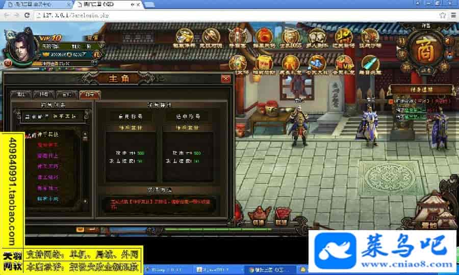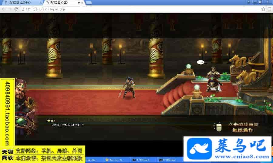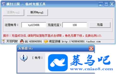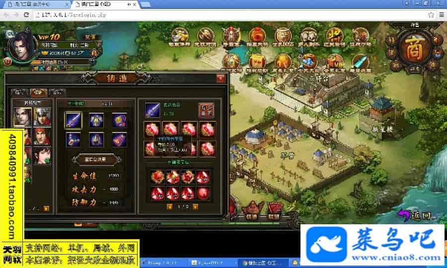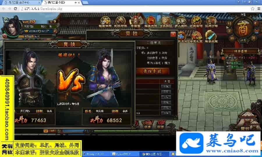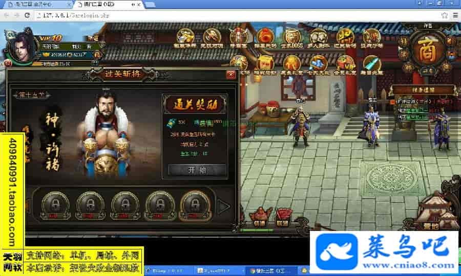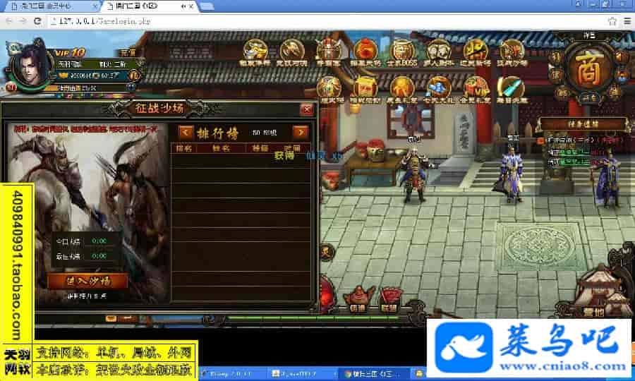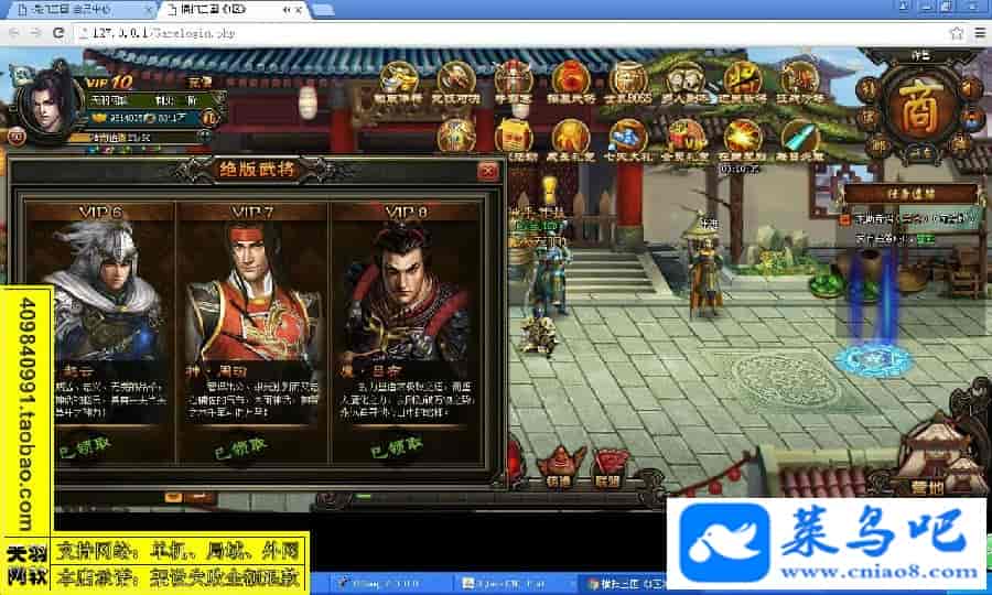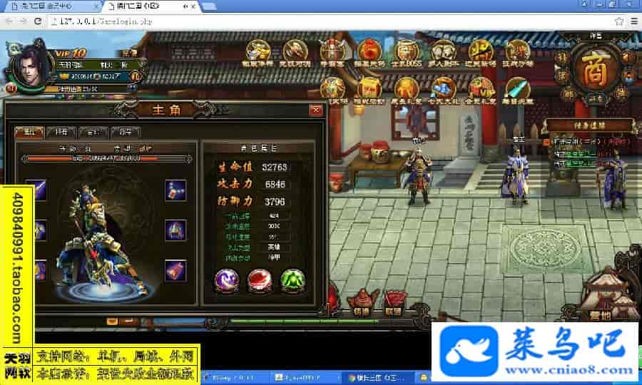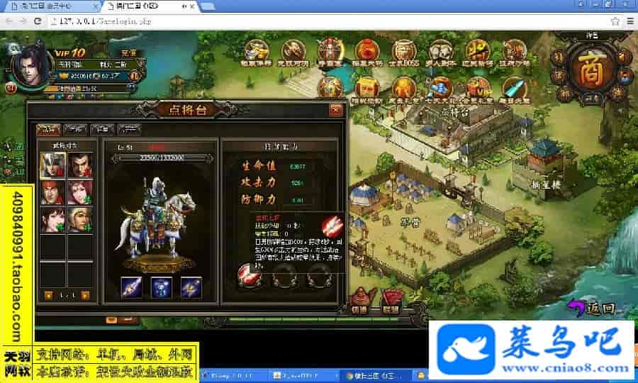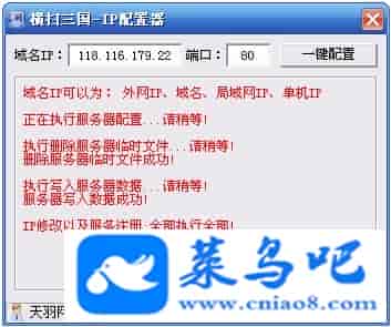游戏名称:横扫三国测试状态:单机、局域、外网 ( 架设外网仅支持独立服务器+IP )支持系统:服务端架设系统win2003/XP -32位;玩家系统无限制架设要求:请保证服务端所需端口全部开启且未被占用(系统问题请自行解决)配置要求:CPU双核+内存1G+硬盘10G(服务端D盘架设)架设难度:一键端架设指导:语音视频帐号注册:网站数据修改:GM充值工具、一键IP修改工具↓↓游戏更新↓↓1.增加GM充值工具2.增加一键IP修改工具图片展示: