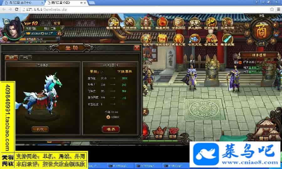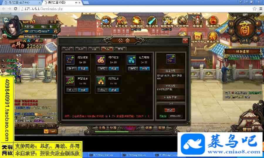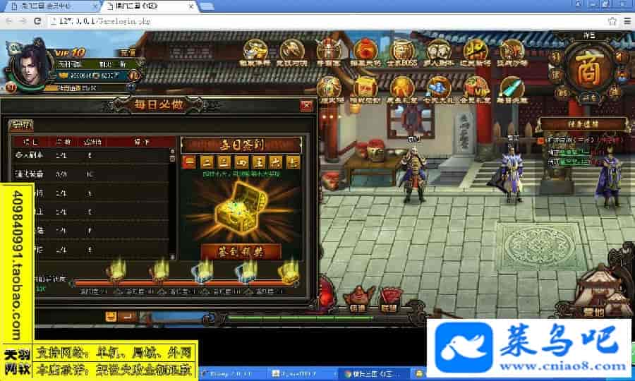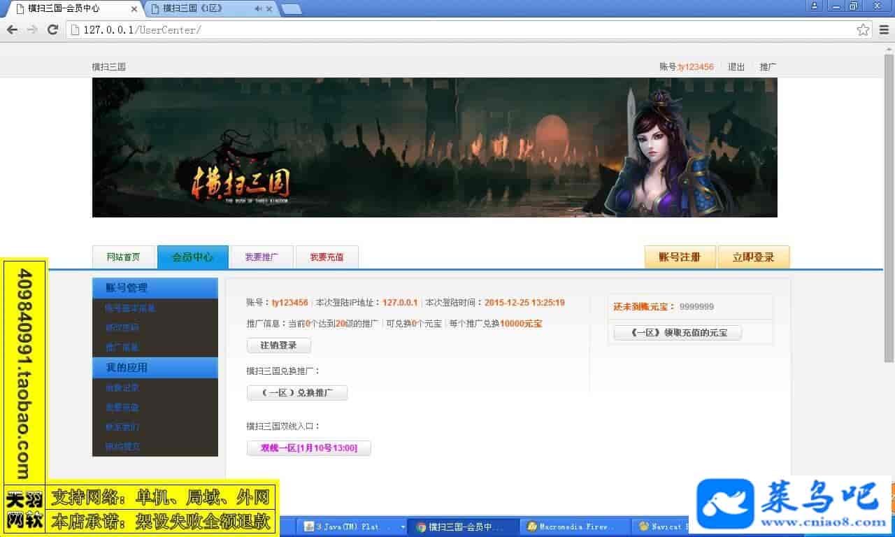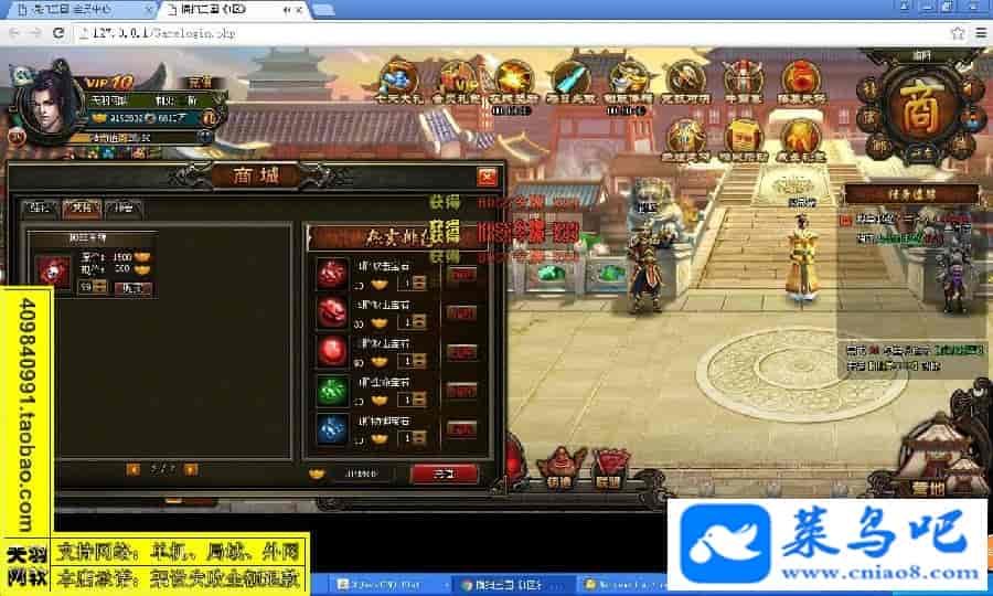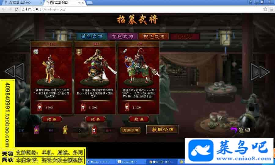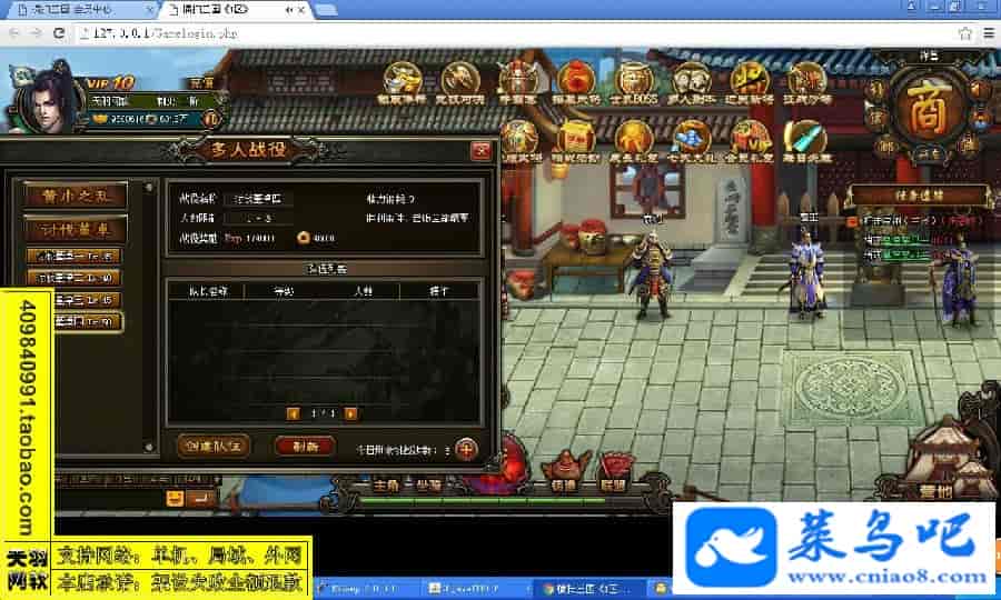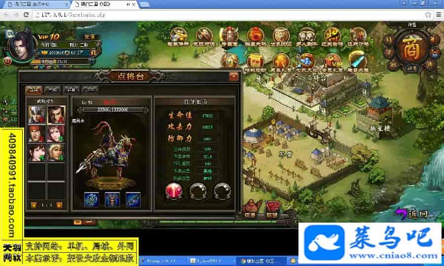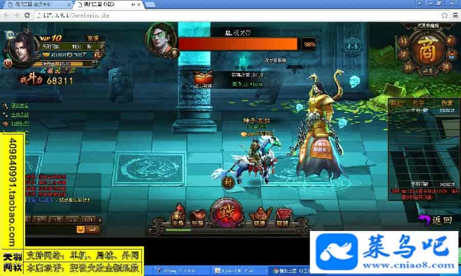 游戏名称:横扫三国测试状态:单机、局域、外网 ( 架设外网仅支持独立服务器+IP )支持系统:服务端架设系统win2003/XP -32位;玩家系统无限制架设要求:请保证服务端所需端口全部开启且未被占用(系统问题请自行解决)配置要求:CPU双核+内存1G+硬盘10G(服务端D盘架设)架设难度:一键端架设指导:语音视频帐号注册:网站数据修改:GM充值工具、一键IP修改工具↓↓游戏更新↓↓1.增加GM充值工具2.增加一键IP修改工具图片展示: