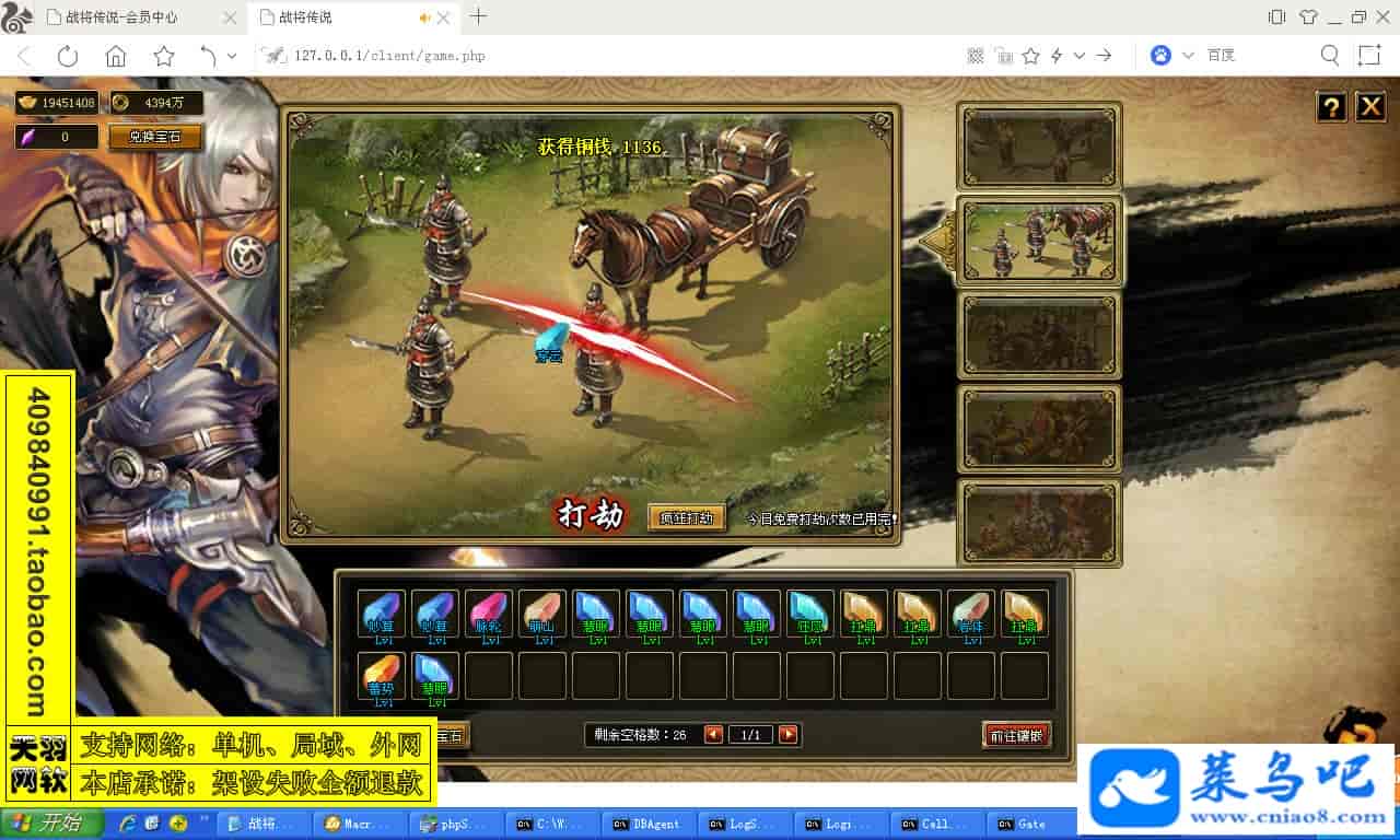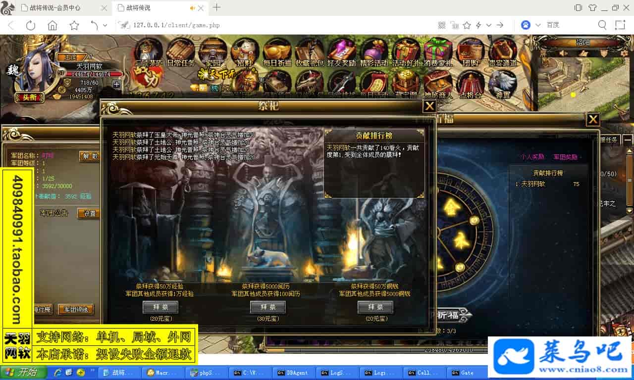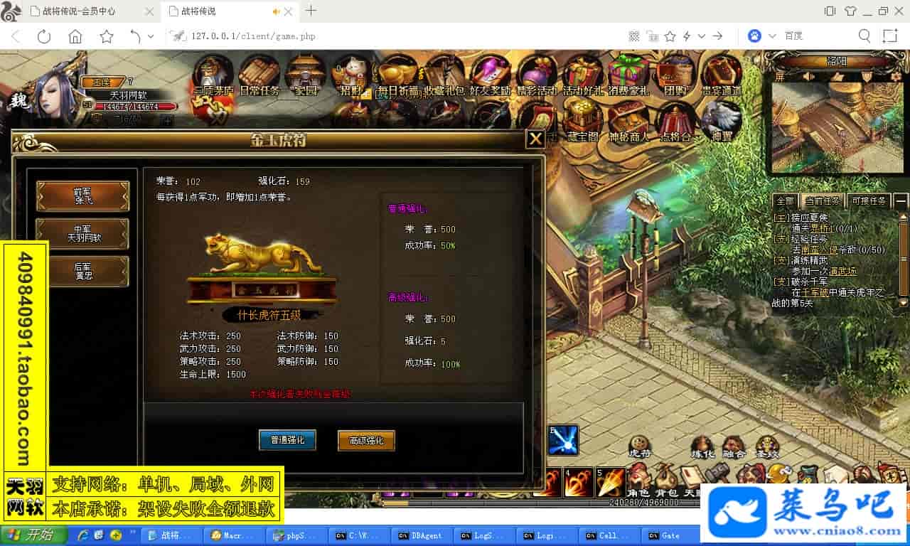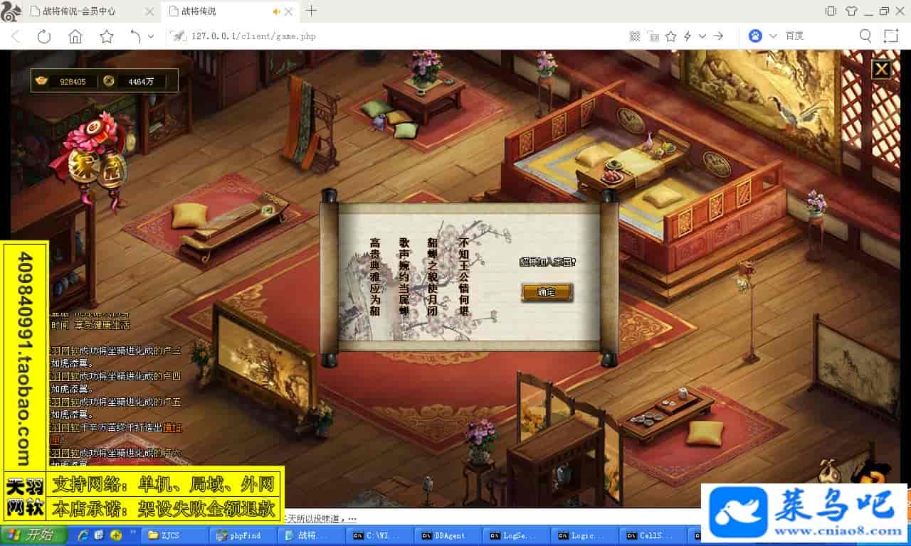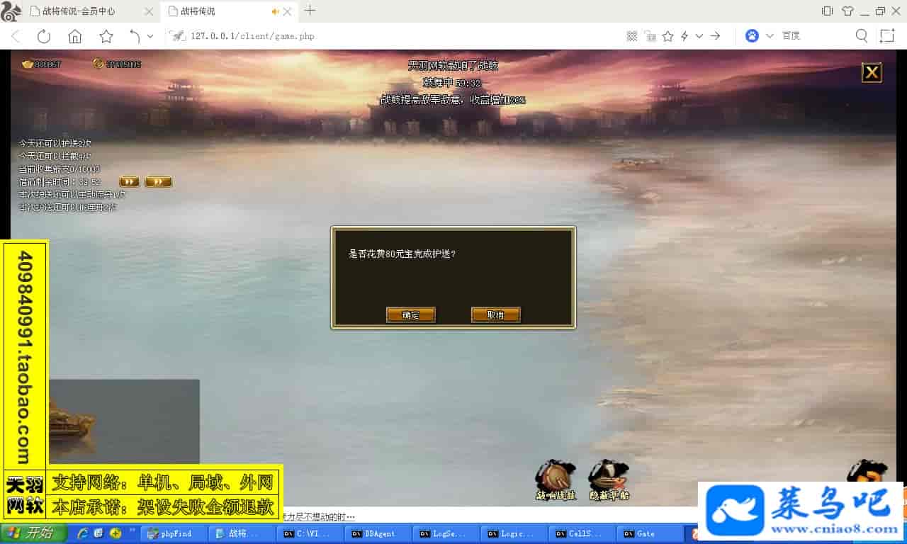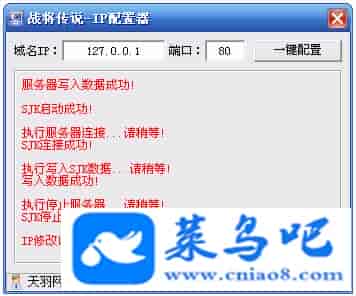 ------------------------〖架设要求〗------------------------游戏名称:战将传说测试状态:单机、局域、外网 ( 架设外网仅支持独立服务器+IP )支持系统:服务端架设系统win2003/XP -32位;玩家系统无限制架设要求:请保证服务端所需端口全部开启且未被占用(系统问题请自行解决)配置要求:CPU双核+内存1G+硬盘10G(服务端D盘架设)架设难度:一键端架设指导:语音视频帐号注册:网站数据修改:GM工具、一键IP修改工具↓↓游戏更新↓↓1.增加GM工具2.增加一键IP修改工具图片展示: