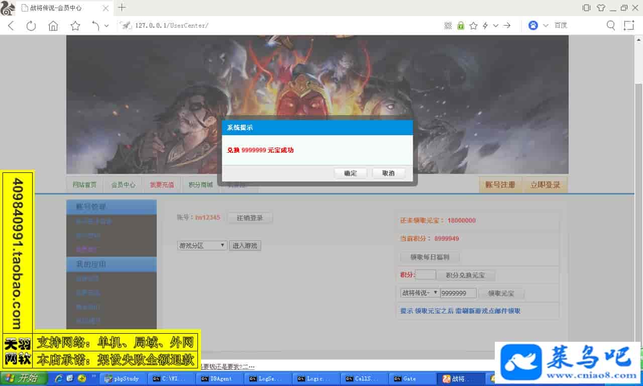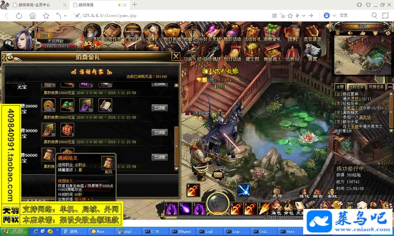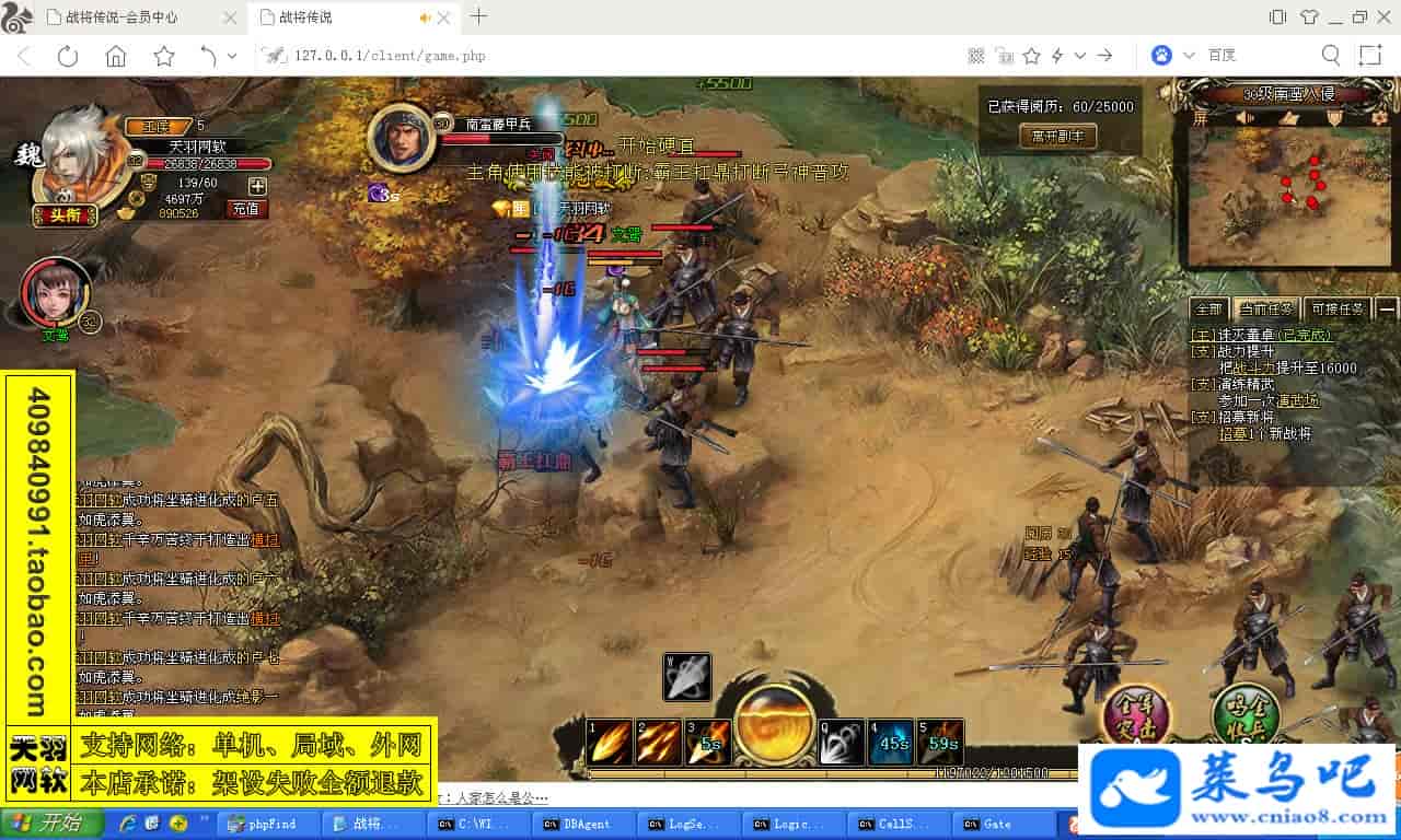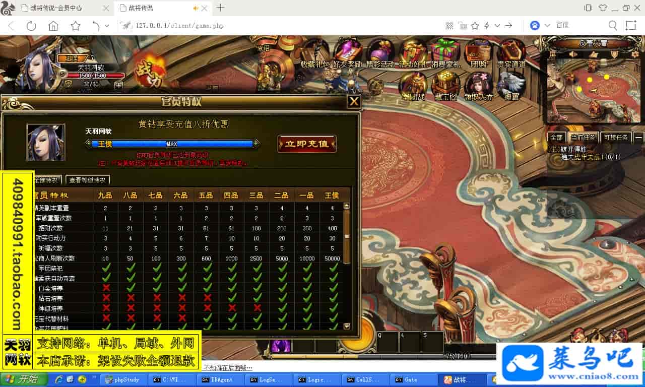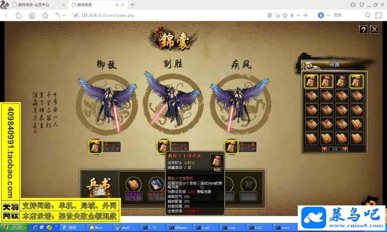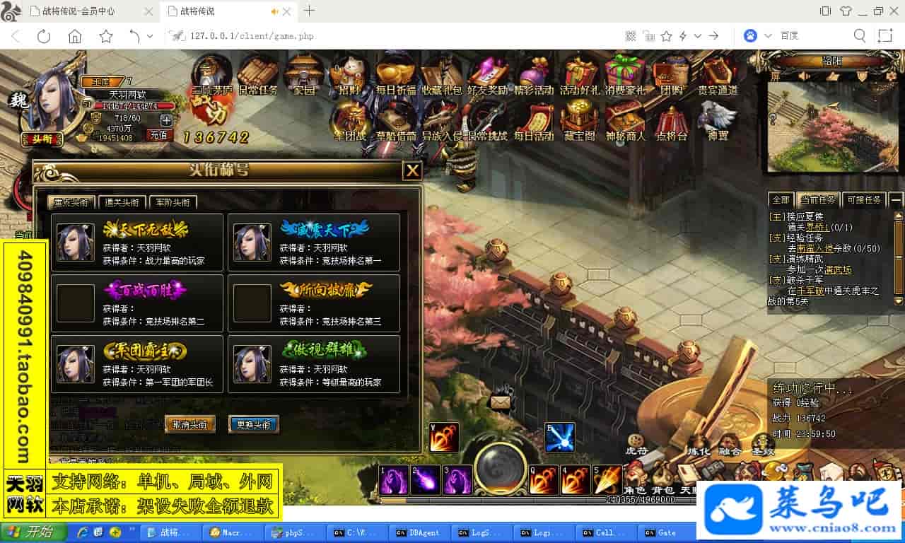 ------------------------〖架设要求〗------------------------游戏名称:战将传说测试状态:单机、局域、外网 ( 架设外网仅支持独立服务器+IP )支持系统:服务端架设系统win2003/XP -32位;玩家系统无限制架设要求:请保证服务端所需端口全部开启且未被占用(系统问题请自行解决)配置要求:CPU双核+内存1G+硬盘10G(服务端D盘架设)架设难度:一键端架设指导:语音视频帐号注册:网站数据修改:GM工具、一键IP修改工具↓↓游戏更新↓↓1.增加GM工具2.增加一键IP修改工具图片展示: