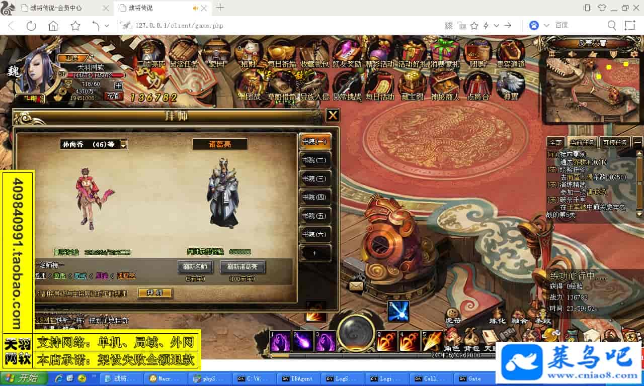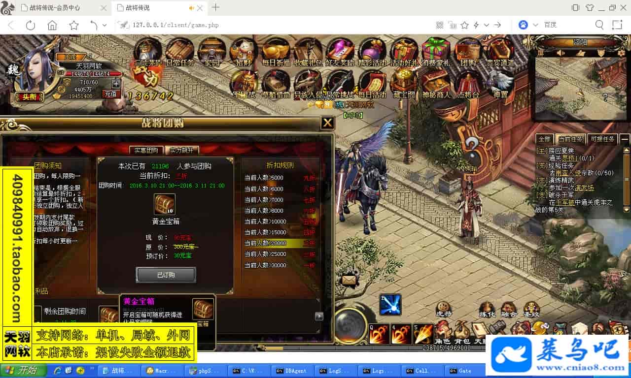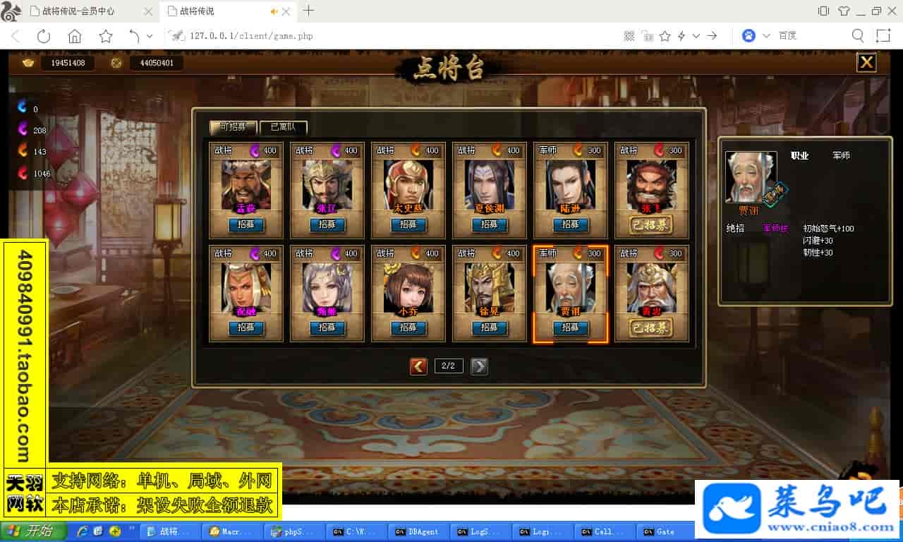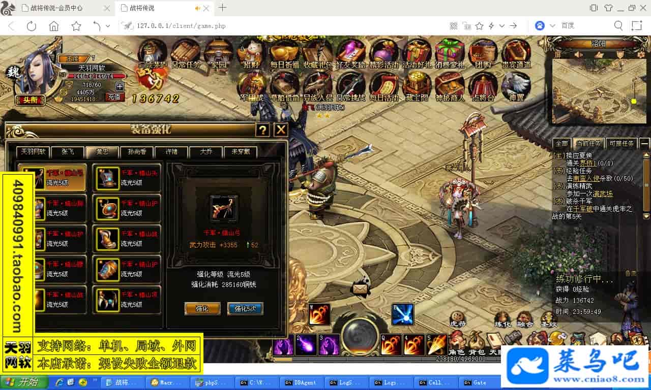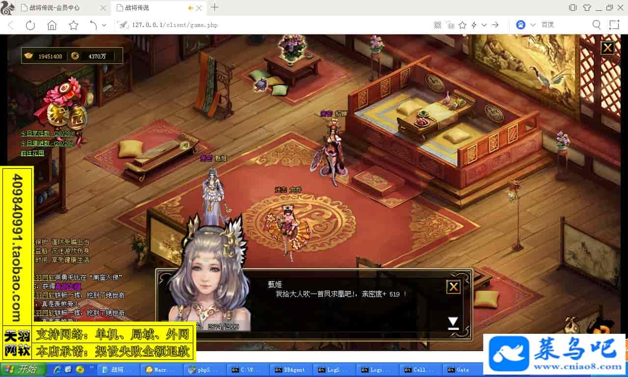 ------------------------〖架设要求〗------------------------游戏名称:战将传说测试状态:单机、局域、外网 ( 架设外网仅支持独立服务器+IP )支持系统:服务端架设系统win2003/XP -32位;玩家系统无限制架设要求:请保证服务端所需端口全部开启且未被占用(系统问题请自行解决)配置要求:CPU双核+内存1G+硬盘10G(服务端D盘架设)架设难度:一键端架设指导:语音视频帐号注册:网站数据修改:GM工具、一键IP修改工具↓↓游戏更新↓↓1.增加GM工具2.增加一键IP修改工具图片展示: