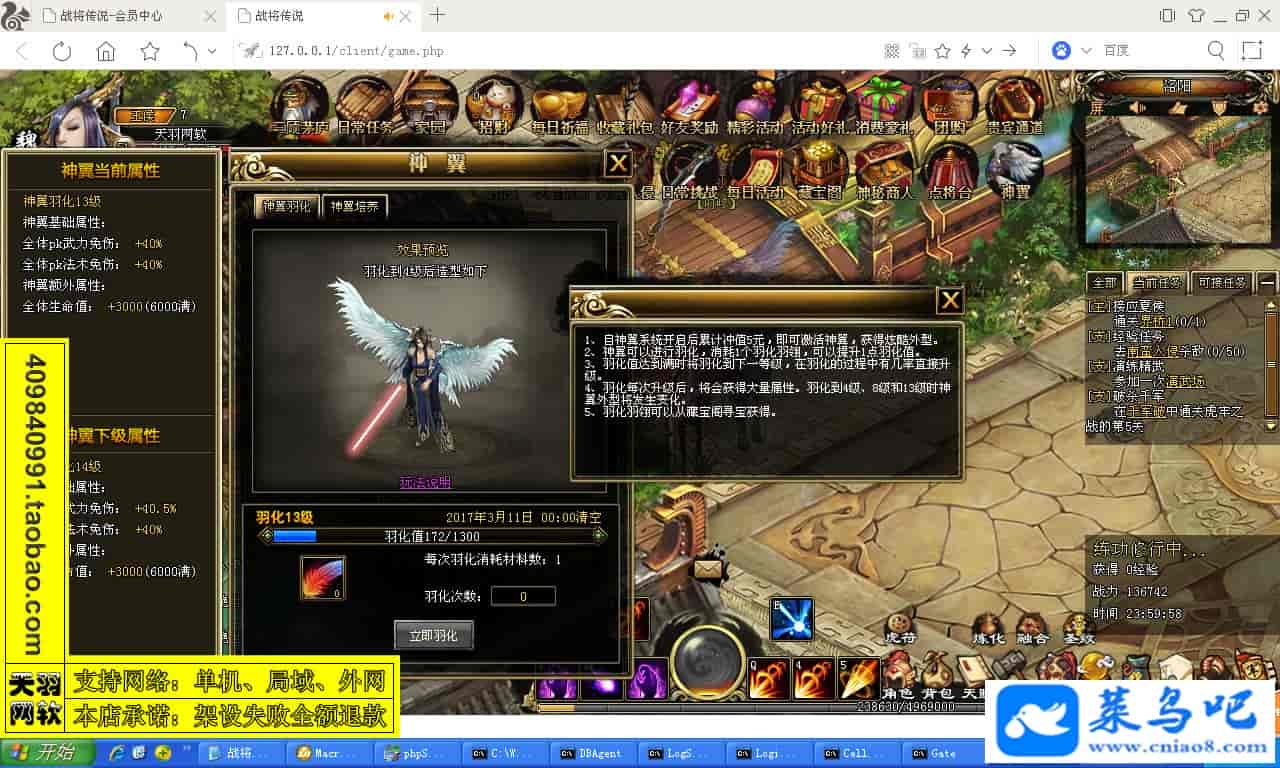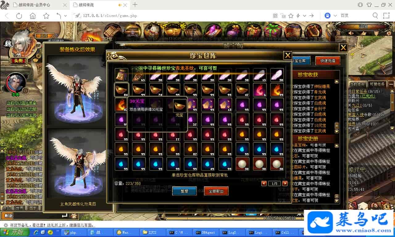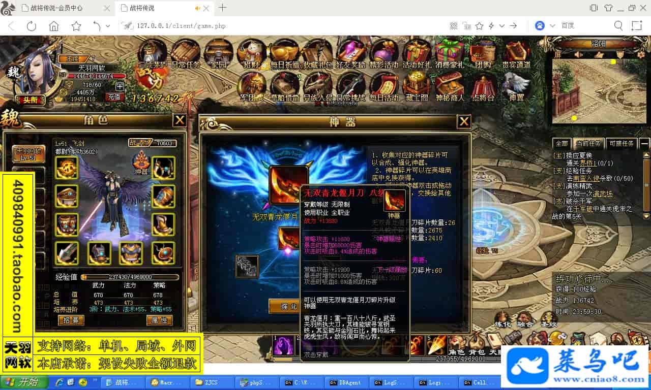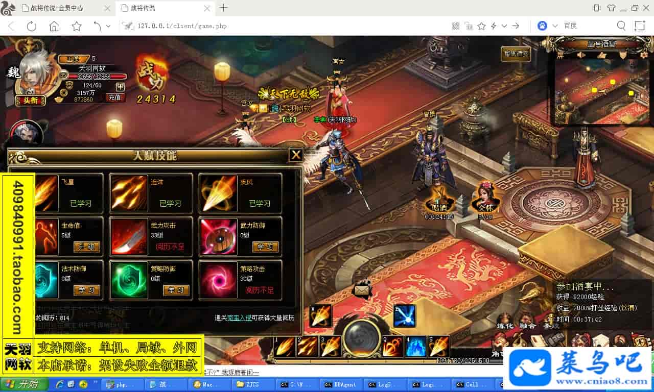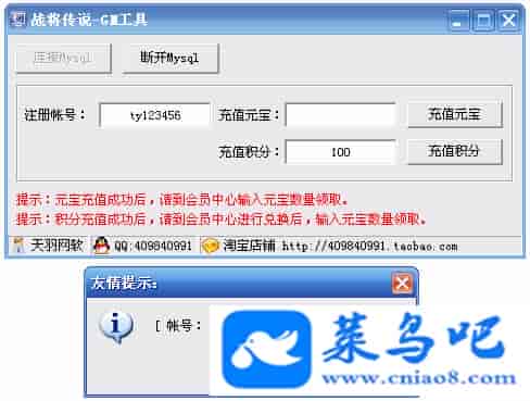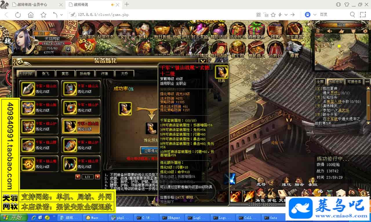 ------------------------〖架设要求〗------------------------游戏名称:战将传说测试状态:单机、局域、外网 ( 架设外网仅支持独立服务器+IP )支持系统:服务端架设系统win2003/XP -32位;玩家系统无限制架设要求:请保证服务端所需端口全部开启且未被占用(系统问题请自行解决)配置要求:CPU双核+内存1G+硬盘10G(服务端D盘架设)架设难度:一键端架设指导:语音视频帐号注册:网站数据修改:GM工具、一键IP修改工具↓↓游戏更新↓↓1.增加GM工具2.增加一键IP修改工具图片展示: