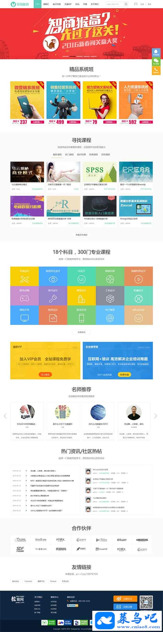 、1.模板名称:"edu!在线教育",版本支持:discuzx3.0版本,discuzx3.1版本,discuzx3.2版本,包括①网站首页②VIP页面③论坛版块(后台大版块设置一行2列,3列,4列都可以,不要默认的0或者多列)④论坛列表页⑤论坛内容页⑥课程汇总⑧瀑布流⑨关于我们10.资讯(文章)内容页11.其他页面等(可以添加N个)等,网站代码工整简洁seo优化良好,让您网站更佳汇聚人气,助您网站成功!