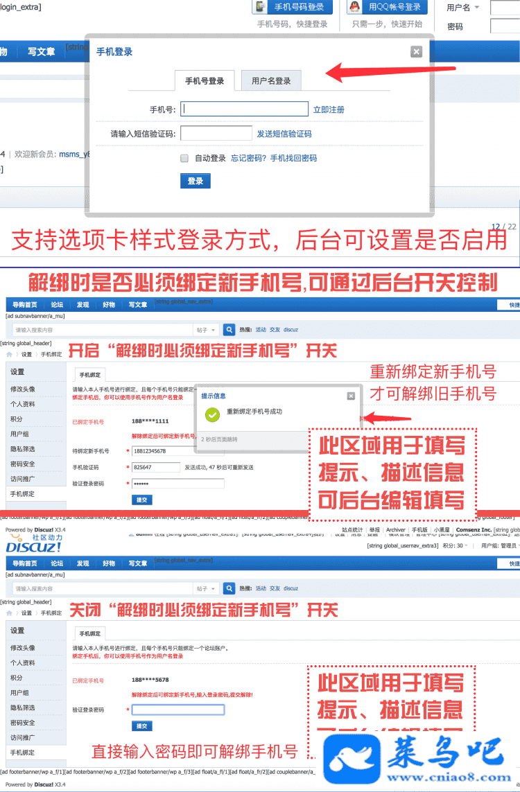 支持针对站长在后台 防灌水 --- 账号保镖 --- 安全登录 中,对某些用户组设置了“强制QQ登录”、“强制邮箱登录”的检测,设置后,对应用户组,同样无法使用手机号登录。