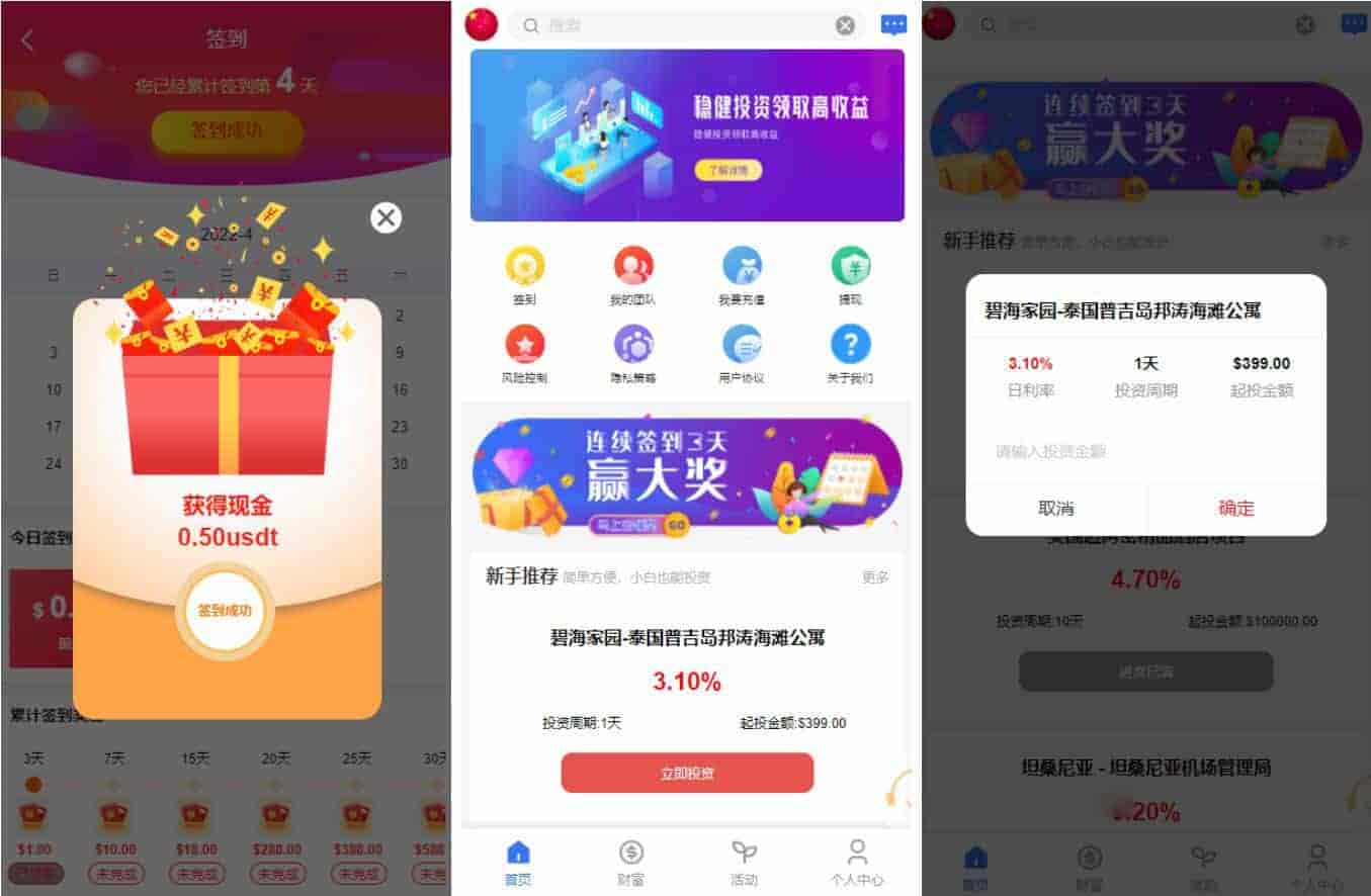 用户注册成功->认证邮箱->充值->购买项目->生成订单->根据设定的收益每日返利