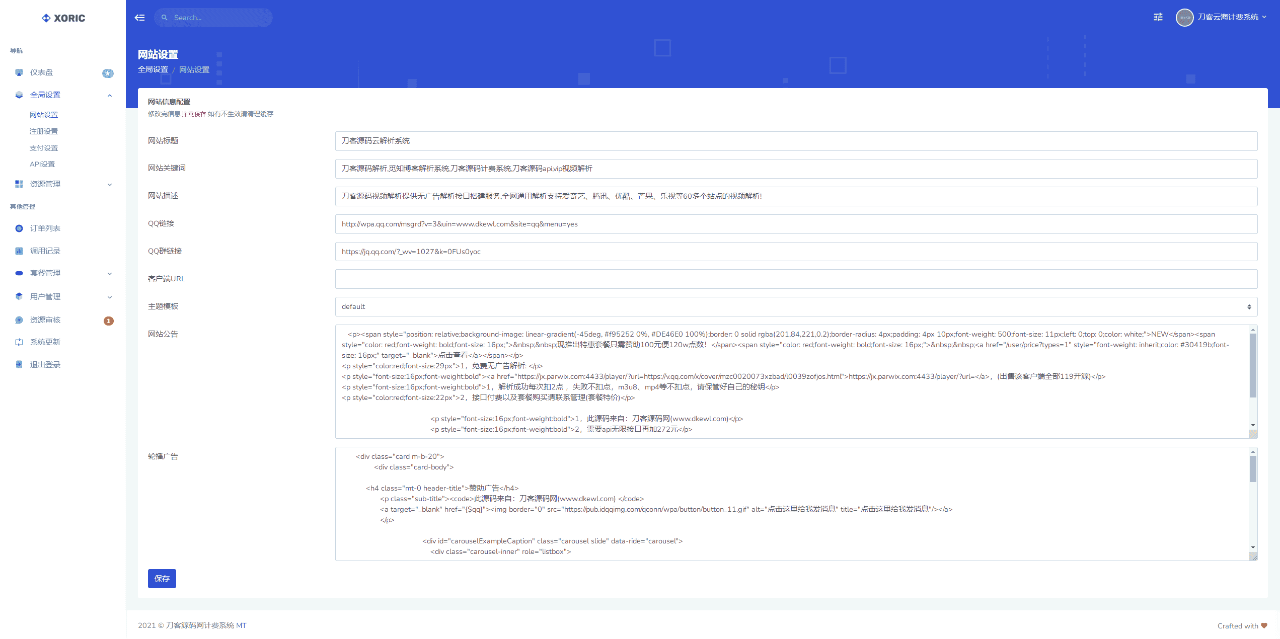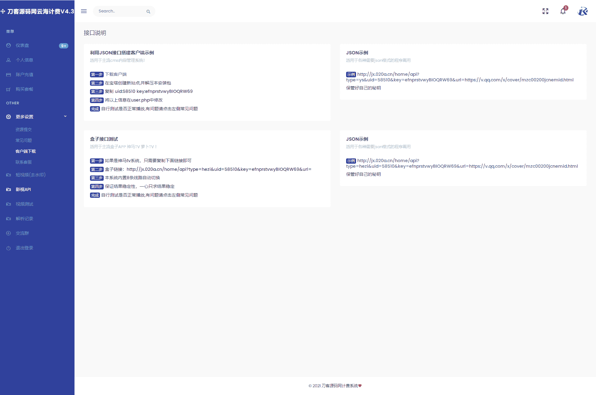 这款源码为云海计费解析系统全网最新版本系统,所有源码均本地化,无任何加密,云海解析计费系统V4.3 是一款 VIP 视频计费解析系统,源码只需要在后台设置 json 视频解析接口,设置好以后即可完成视频解析功能,本程序功能强大,v4.3 最新版本为是完整全套系统!