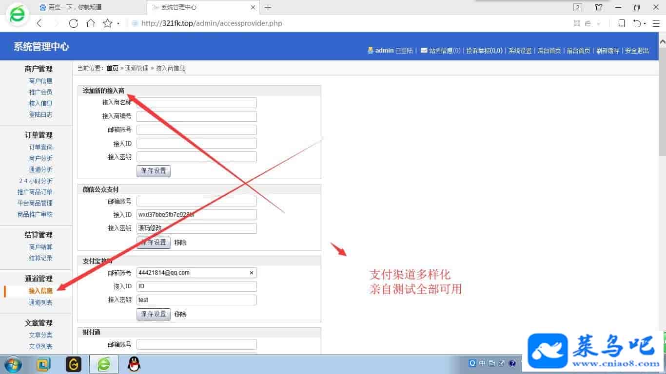 登陆后台-> 通道管理-》接入信息-》 手机支付宝接口 填写相关设置