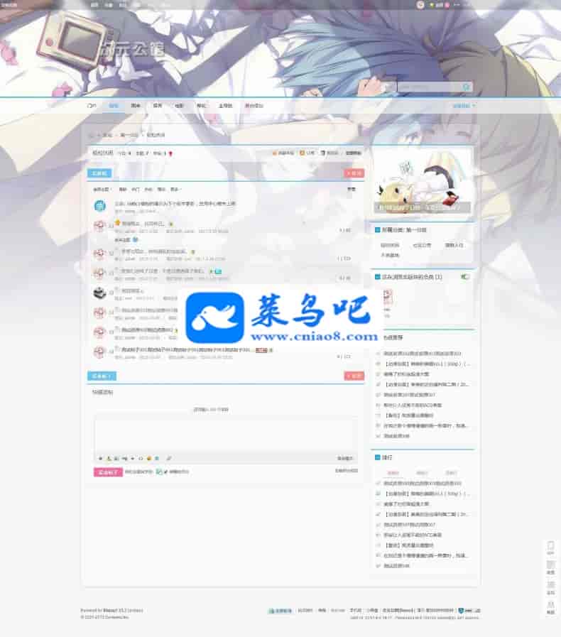 ACGI_C1,清新二次元风格,模板主体采用半透明效果,窄屏1200px,宽屏最大1600px,一键切换宽窄屏,轻量级动态效果,本版本为纯论坛模板,更清新简洁的风格,模板兼容各主流浏览器(火狐、360、谷歌等),动态效果不兼容IE旧版本的浏览器,正常显示页面兼容ie8,建议使用Chrome内核浏览器以获取更好的体验。