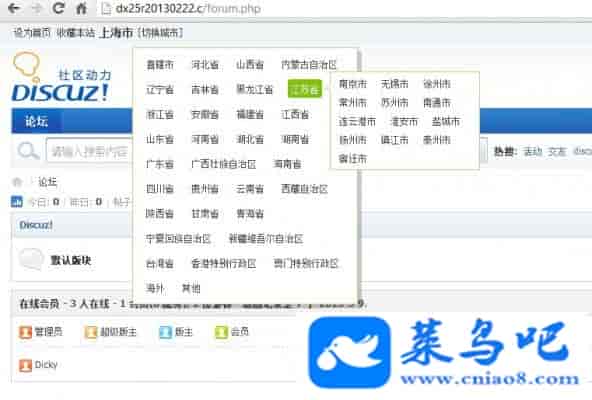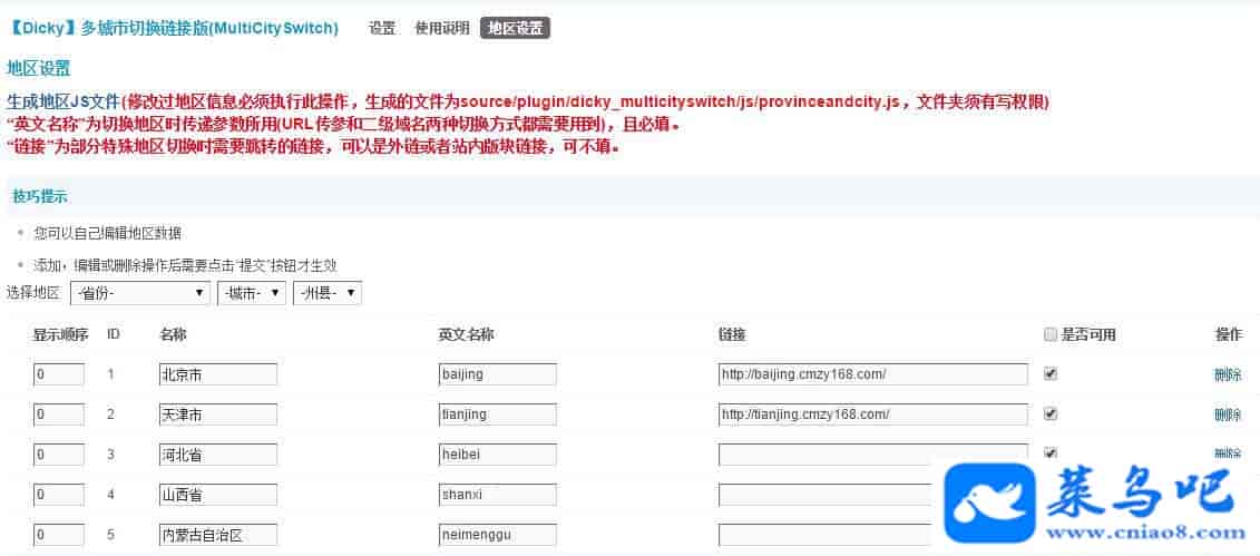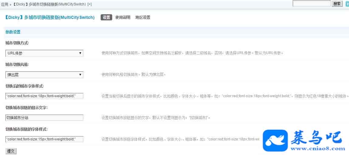 多城市切换(MultiCitySwitch) For Discuz! X 2.0/2.5/3.0/3.1/3.2,本插件设计的初衷是方便广大站长做成多城市网站,插件安装好需要在FTP配置,不懂的请不要购买。可以随意切换到其它城市分站(第一次访问根据访问者IP自动识别所在城市并跳转到所在城市分站,后台设置城市二级域名英文名称)。当然此版本只是为了满足部分站长只想切换子域名,帖子不需要按城市筛选。如需要完整的功能(完整版功能包括第一次访问根据访问者IP自动识别所在城市并跳转到所在城市分站,后台设置城市二级域名英文名称,后台按城市设置友情链接,后台SEO设置增加面包屑导航按城市显示的设置,按城市地区发帖和浏览帖子,可以搜索当前城市帖子或者全站帖子,按城市投放广告,