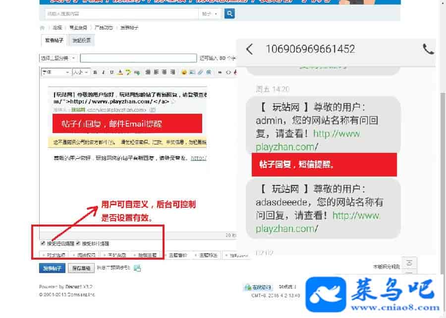 回帖手机短信通知,同时支持手机版(增加用户粘性。)用户发帖后,有人回帖,会有短信提醒。(后台可配置)