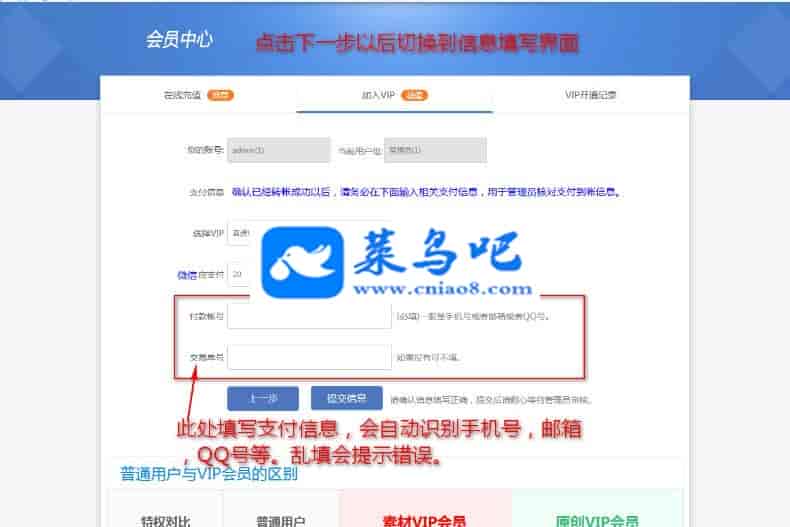 2、用户按页面提示进入下一步,填写支付信息,提交后待管理员审核。