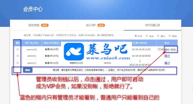 3、管理员收到支付消息(一般手机支付宝、微信、还有QQ收到钱之后会即时提醒)以后,进入网站,点击网站上的审核通过按钮,则用户自动成为VIP成功,赠送的相应积分会即时到帐。