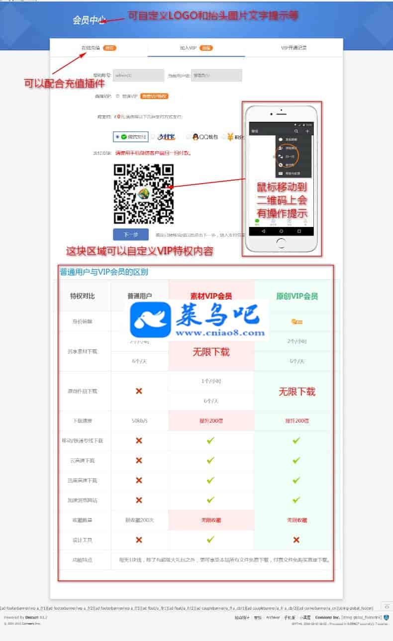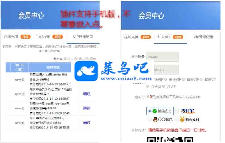 插件支持积分支付,微信支付,支付宝支付,QQ钱包(财富通)支付购买VIP。支持个人帐号,不用签约,支持手机版转帐,支付即时到帐,零手续费,界面美观。
