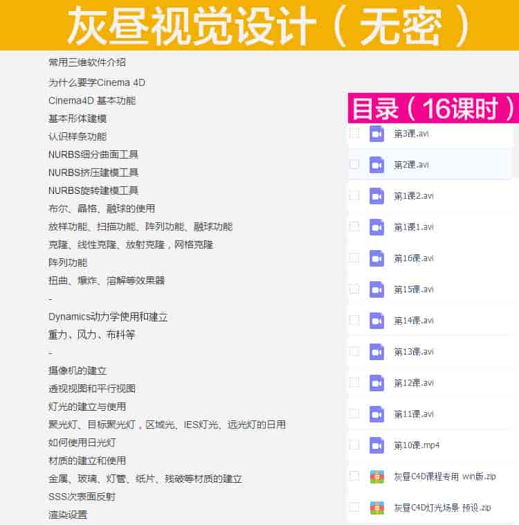 此视频教程为灰昼C4D线上班(第一期),全套16课时17个视频文件