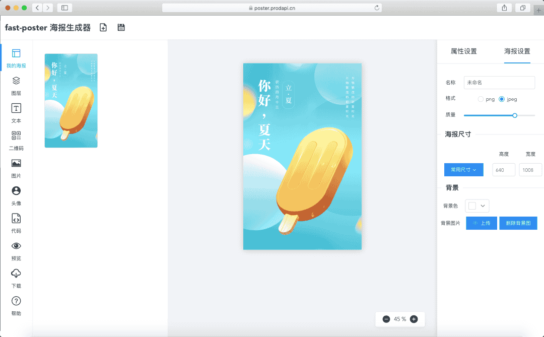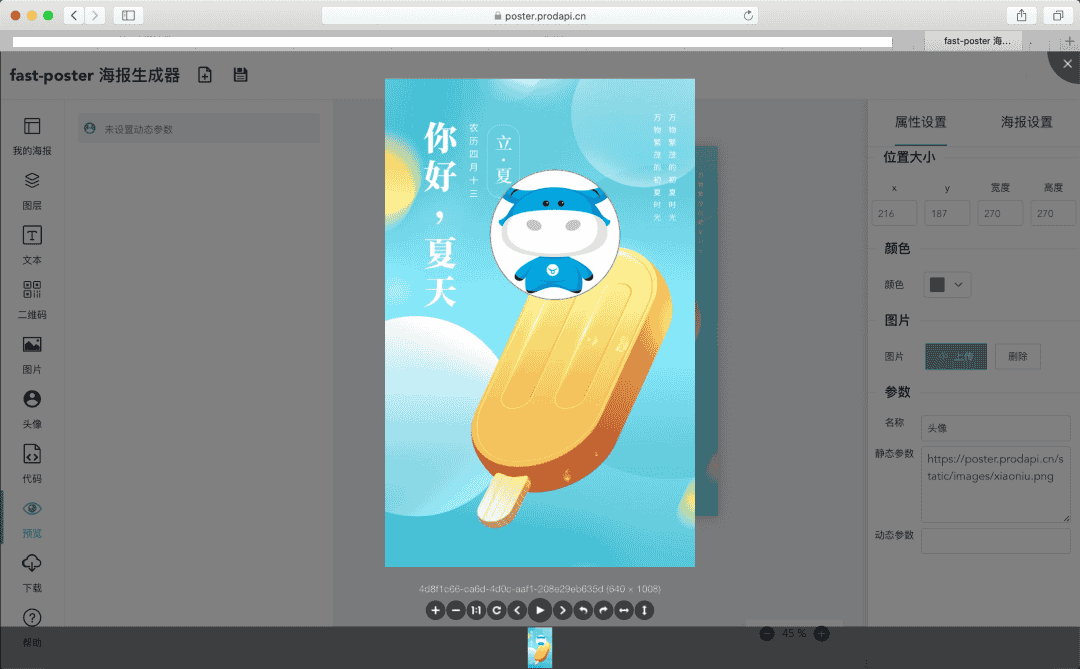 快速:三步完成海报开发工作:启动服务 > 编辑海报 > 生成代码简单:组件丰富、支持拖拽、复制、所见即所得、下载等功能。动态:无需更改代码,直接在编辑器修改海报即可获得最新的海报。