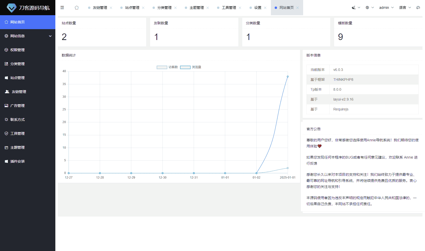 网站设置 分类设置 网站管理 工具管理 友情链接 广告管理 联系方式 主题管理