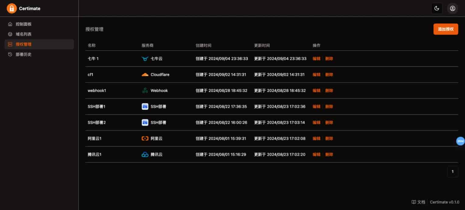 1、用户通过 Certimate 管理页面填写申请证书的信息,包括域名、DNS 服务商的授权信息、以及要部署到的服务商的授权信息。