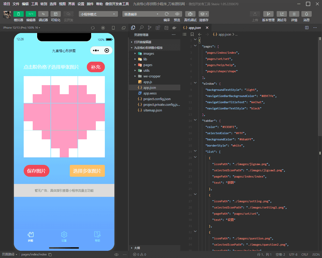 九宫格心形拼图小程序源码,带流量主微信小程序源码。可以自定义拼图形状,保存张数