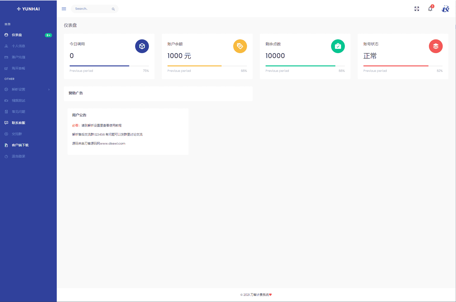 源码含:替换系统、计费系统、客户端源码,安装云海解析计费系统需 PHP7 以上