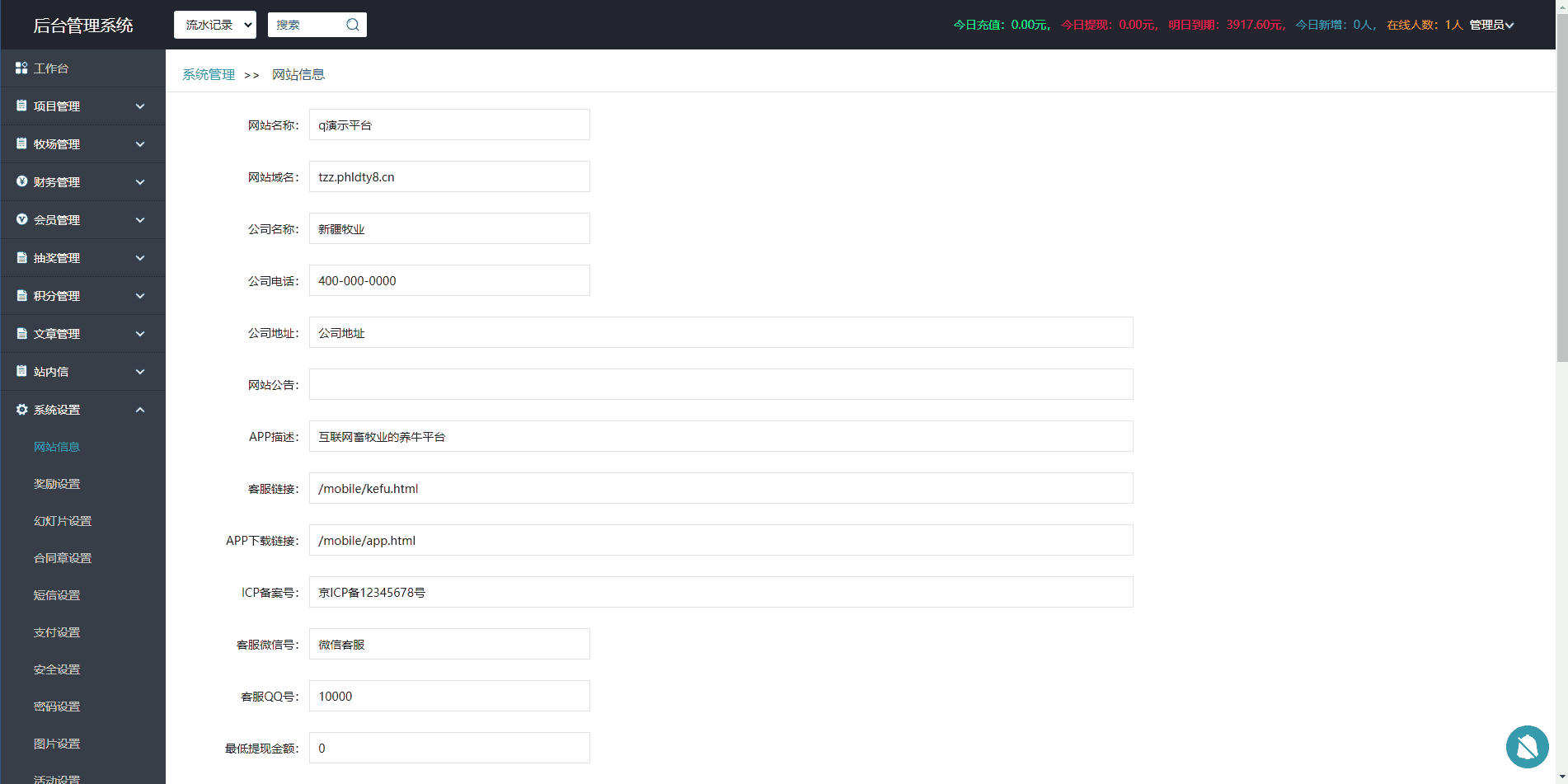 这款养牛农场的源码已经全部整理修复完毕,之前总是掉链子的人机验证也已经删掉了,非常全面的一款投资理财类源码,资金明细、收益明细等等都非常清楚,自带的签到、推广、转盘抽奖、积分商城也都非常好用,实名认证和银行卡认证已经对接了专业的api接口,在后台填写调用即可。支付接入派特个人免签,微信支付宝双通道,短信和支付的地址都写在教程里了。