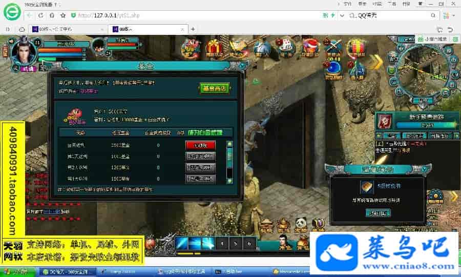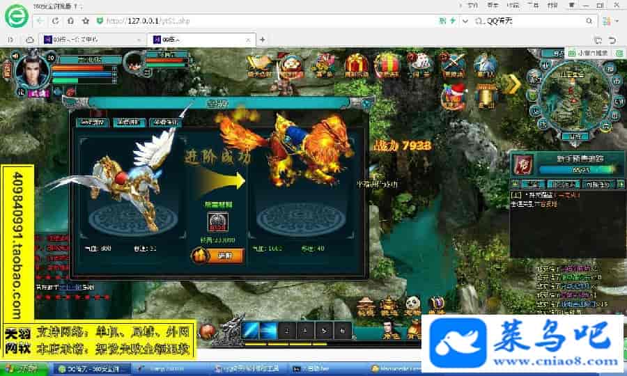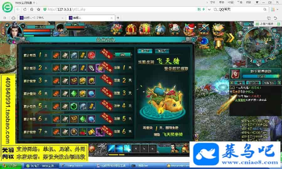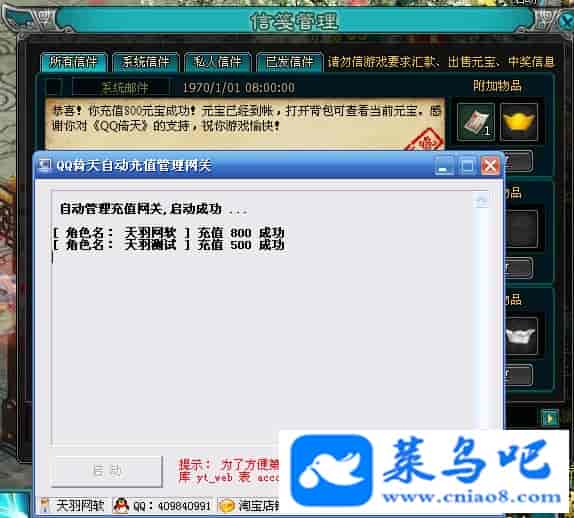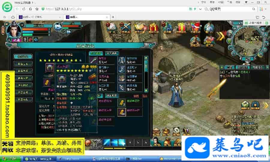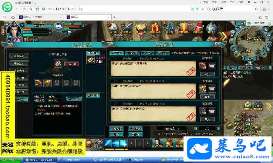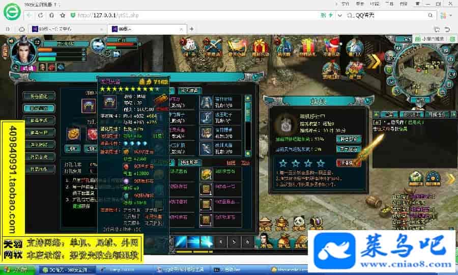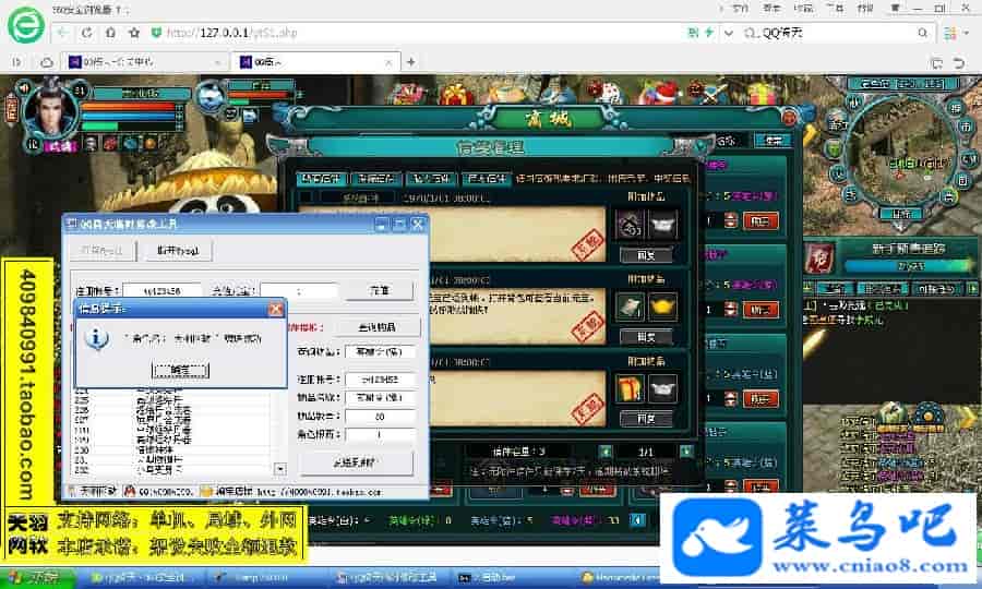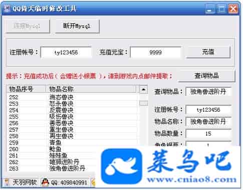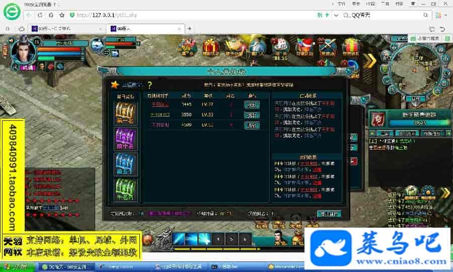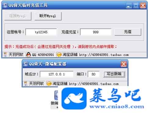 游戏名称:倚天测试状态:单机、局域、外网 ( 架设外网仅支持独立服务器+IP )支持系统:服务端架设系统win2003/XP -32位;玩家系统无限制架设要求:请保证服务端所需端口全部开启且未被占用(系统问题请自行解决)配置要求:CPU双核+内存1G+硬盘10G(服务端D盘架设)架设难度:一键端架设指导:语音视频帐号注册:网站数据修改:数据管理工具、一键IP修改工具↓↓游戏更新↓↓1.增加数据管理工具2.增加一键IP修改工具3.增加微端配置器图片展示:
