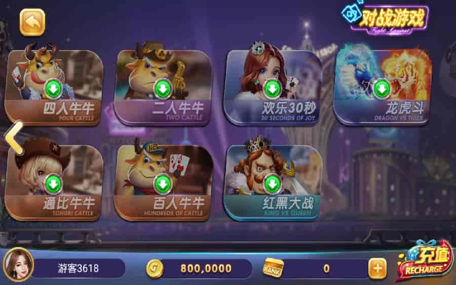 棋牌游戏:炸金花、经典斗地主、通比牛牛、四人牛牛、二人牛牛、百人牛牛、欢乐30秒、红黑大战、龙虎斗