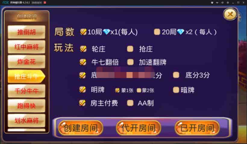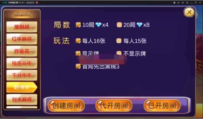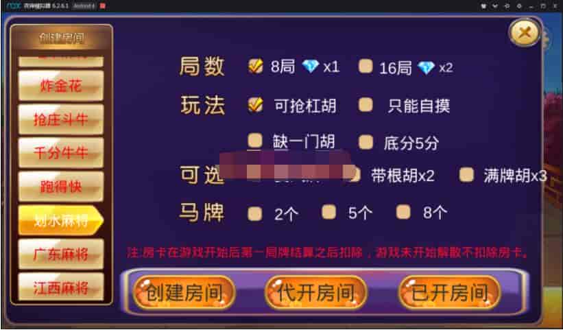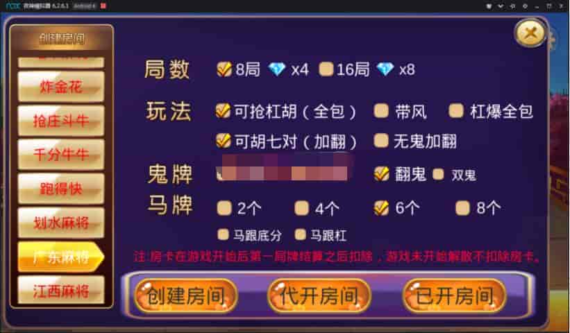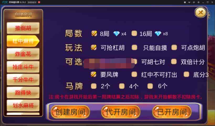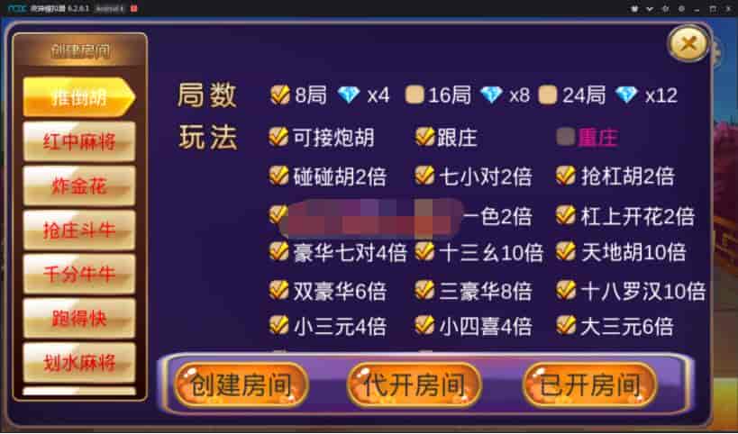 游戏包含:推倒胡、红中麻将、金花、抢庄斗牛、千分牛牛、跑得快、划水麻将、广东麻将、江西麻将。