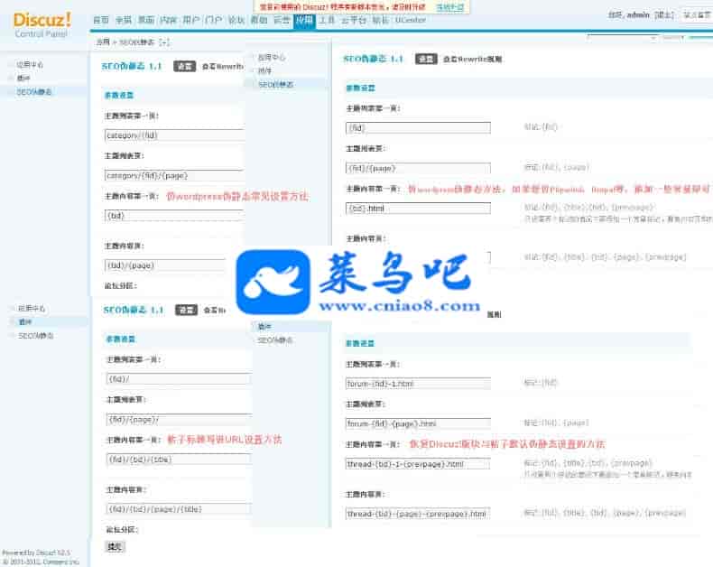 使用本插件前,要先将帖子的伪静态规则也就是thread与forum那一条规则添加回规则里面去,可以放在规则的最前面; 然后本插件才可以将Discuz!默认的帖子链接thread-1-1-1.html与版块链接跳转到目录化伪静态链接上去;