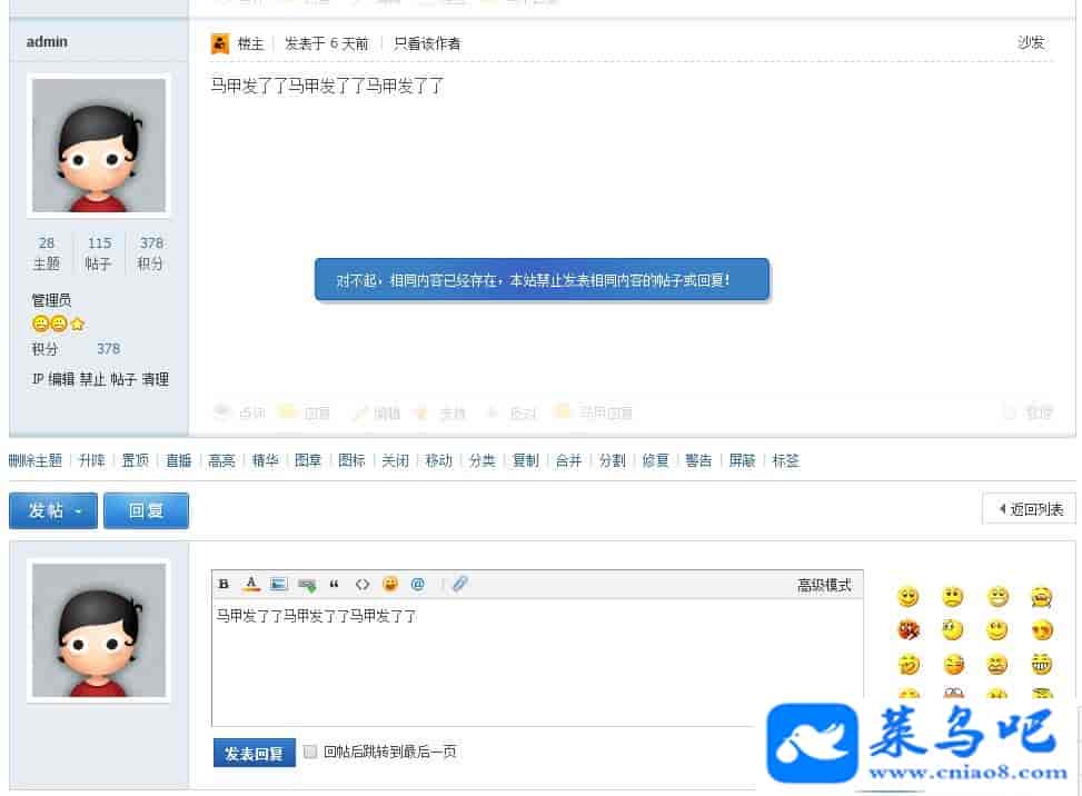 重复帖过滤 For Discuz! 是一款管理增强类插件,前台可以屏蔽用户发布相同贴、回复相同内容,后台可以批量查找论坛内已存在的重复主题并进行批量管理!