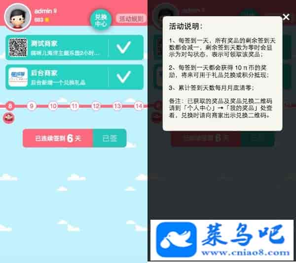 颠覆原有签到模式,全新理念设计兑换礼品积分+连续天数兑换礼品。