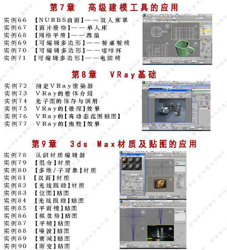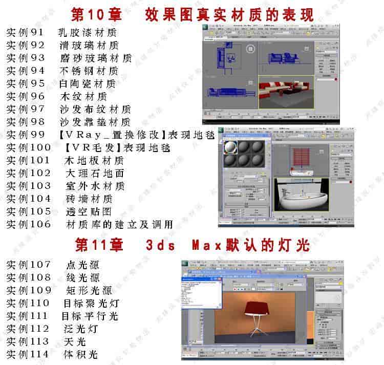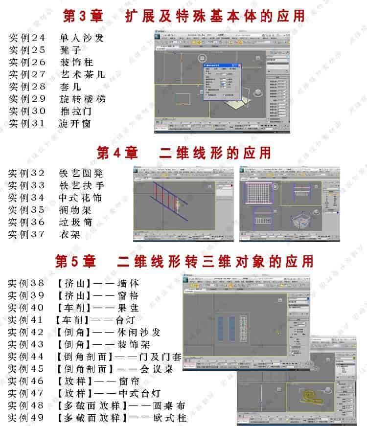 《3dmax2012/VRay效果图制作实战从入门到精通》共分为25章节,结构安排得当,重点突出,实例的设置严格遵循实际的操作规范,使读者能够学以致用。本教程首先讲解了3ds max 2012的基本技术,包括:工作界面、基础操作、基本建模、二维线形建模、二维转三维建模的基本操作、使用三维修改器进行建模的操作方法、高级建模的应用、VRay渲染设置技巧、材质表现的应用、灯光和摄影机的应用:然后从提升效果图制作技能的角度出发,逐渐深入讲解,内容包括室内装饰物的制作、室内各种灯具的制作、室内各种家具的制作、室外建筑构件的制作;最后,通过综合应用案例的实战练习,学习专业效果图的制作,包括:室内效果图的制作、室外效果图的制作、室内效果图的后期处理、室外效果图的后期处理和效果图漫游动画的设置等内容。