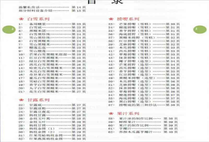 整套配方内容有:白雪系列、甘露系列、捞?系列、鲜榨果汁系列、小丸子系列,西米系列、糯米糍系列、糖不甩系列、凉粉系列小资奶昔系列、奶露系列、冰沙/刨冰系列、双皮奶系列、豆腐花系列、班戟系列、果爽系列、奶茶系列、手磨糊系列、椰汁糕系列、姜撞奶系列、布甸系列、果冻系列、水果肠粉系列、炖品/糖水系列、龟苓膏系列、手打冰淇淋系列、泰国黑珍珠系列、特饮系列、仙草系列、雪梅娘系列、多芒/水晶系列、特色小吃系列,