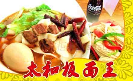 主料选用优质面粉,调加自制面料,经过醒、擀、摔等特殊技法加工的面条更筋道、更滑爽。好马配好鞍,好汤配好面,用此法加工的板面面质筋道无比,汤味浓愈鲜香,口感无与伦比,一吃上瘾,食者无不感叹:太和板面,面中之王,食太和板面,天下无面 。