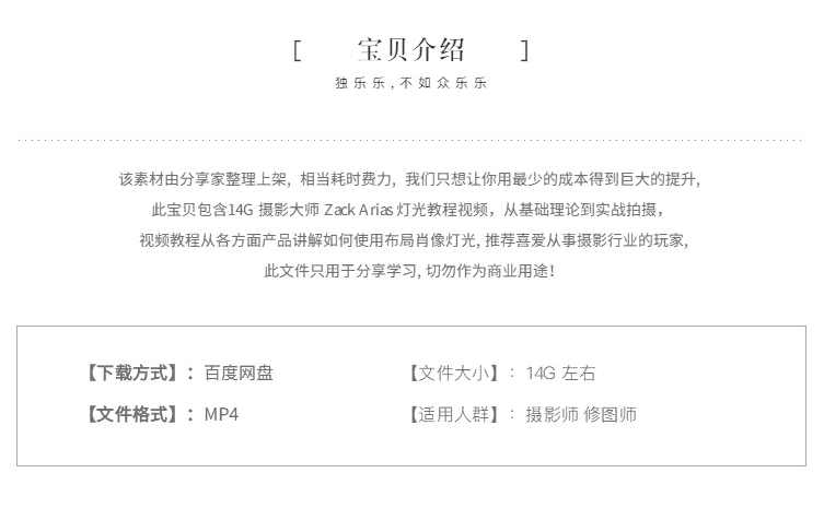 Zack Arias 单灯摄影艺术 第二季摄影艺术家Zack Arias经常辗转于世界各地为不同地域不同风格的客户拍摄人像艺术作品,他的作品为什么这么吸引人呢?不是他采用了世界最顶级的相机,也不是他有一个无敌于天下的创作团队,其实看似很简单,就在于他那迷人的“单灯的魅力”,就在于他对摄影艺术的非凡造诣和孜孜以求…他,摄影艺术家—— zackarias,他马上就会细致而耐心地指导你在不同环境里怎样简单而有效的运用单灯照明技术,创作出与众不同的艺术作品。
