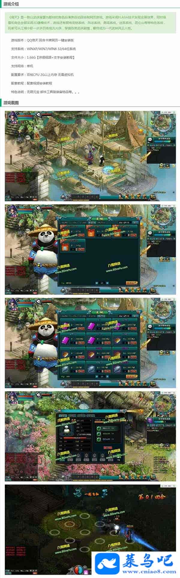 游戏版本:QQ倚天 回合卡牌网页一键安装版支持系统:WINXP/WIN7/WIN832/64位系统文件大小:1.66G【详细视频+文字安装教程】支持网络:单机配置要求:双核CPU 2G以上内存 无需虚拟机配套教程:配套视频安装教程特色说明:无限元宝 邮件工具刷装备物品等。。。本游戏设置为仿官方设置不变态。可以做任务慢慢玩升级玩上去。更多功能请在游戏里面体验《倚天》是由广东星辉天拓互动娱乐有限公司开发,tengxun游戏运营的一款以武侠背景为题材的角色扮演类自动回合制网页游戏。游戏采用FLASH技术实现全屏效果,同时场景和角色全部采用3D建模技术,游戏还有拥有宠物系统、阵法系统、爬塔系统、迷宫系统、昆仑山等等特色系统,玩家可从江湖小虾一步步历练成为大侠,穿插各类武侠剧情,成为一代武林风云人物。【游戏说明】一键端解压安装。双击运行进入游戏。天刀门,逍遥剑。医仙谷。刺客盟 四大职业翅膀9阶10星。坐骑满级。无限元宝。声望。特色商城。完美任务。武林山庄。卡牌大师。多人闯关。挑战掌门人。个人竞技场。灵气武魂,勇闯光明顶,爬塔。摇钱树。五星系统。神兵系统应有尽有。更新QQ倚天物品ID+邮件发送工具 数据库修改无限元宝 金钱 声望9999999 等级随意改 VIP武魂 附外网教程注意:安装之前请把所有的杀毒软件(360等)关闭否侧安装不成功,请放心游戏因加密会误报病毒,杀软关闭后运行即可。