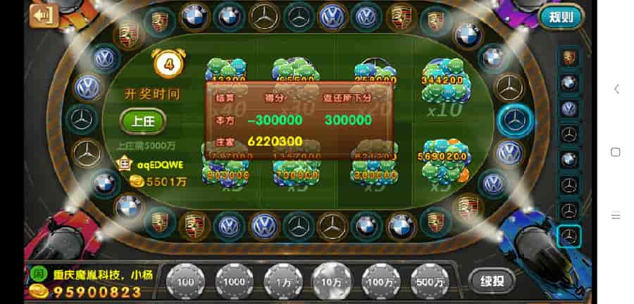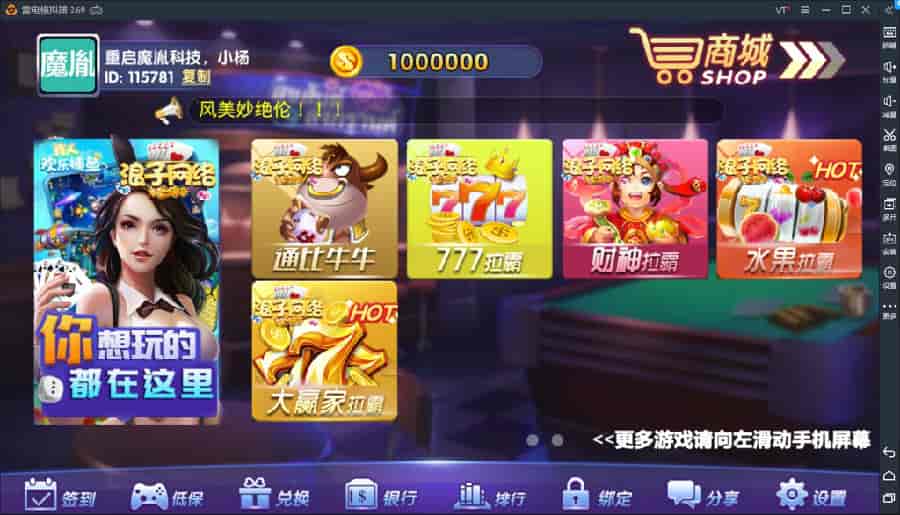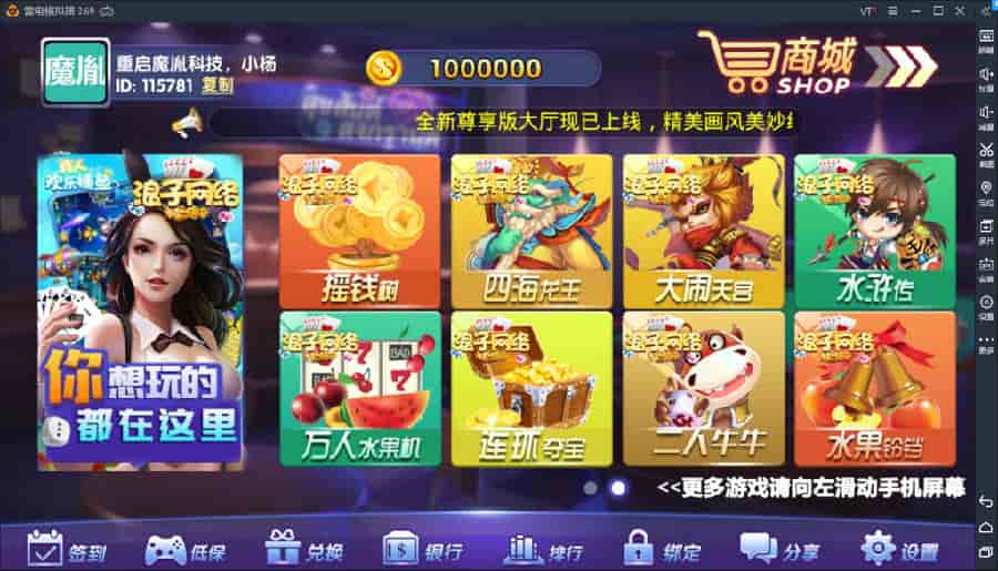 内含游戏:万人水果机 水果垃霸 二人牛牛 财神垃霸 百人牛牛 奔驰宝马 百家乐 飞禽走兽 金鲨银鲨 水果铃铛 大赢家拉霸 四人牛牛 连环夺宝 四海龙王 大闹天宫 李逵劈鱼 金蟾捕鱼 摇钱树捕鱼 777垃霸 通比牛牛 水浒传