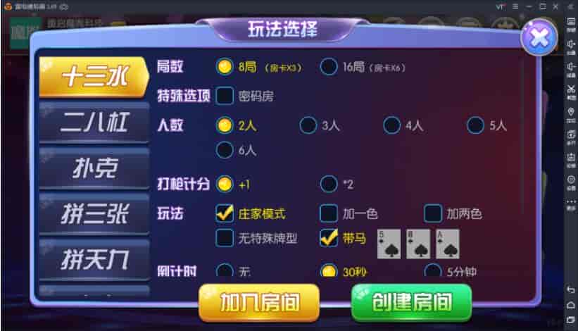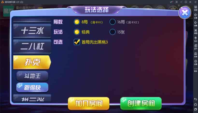 扑克:拼三张、牛牛、斗地主、跑得快、填大坑、十三水。