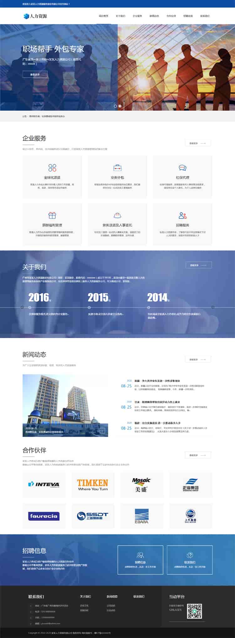 织梦内核开发的模板,该模板属于企业通用、人力资源服务类企业使用,一款适用性很强的模板,基本可以适合各行业的企业网站!