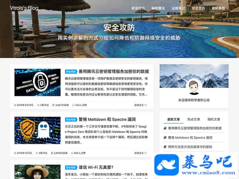可设置seo关键字及站点描述页面伪静态,自定义的顶部样式(背景图 ),支持图片轮播、侧边栏文章聚合、广告栏、点赞和社交化分享等功能,以及漂亮的博客订阅功能组件,让你的个人博客更加与众不同。