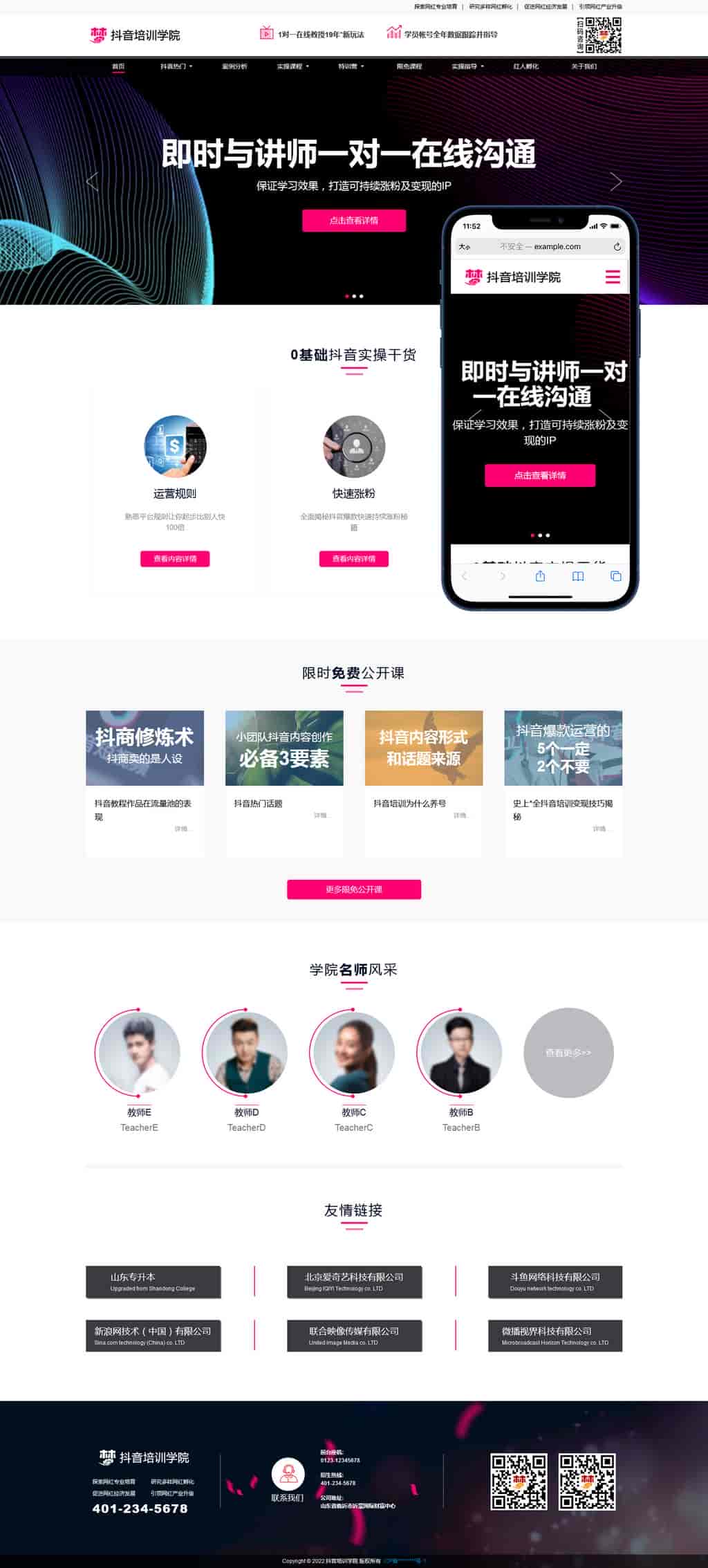 模板名称:(自适应手机端)响应式抖音红人培训小视频拍摄技巧培训机构pbootcms模板
