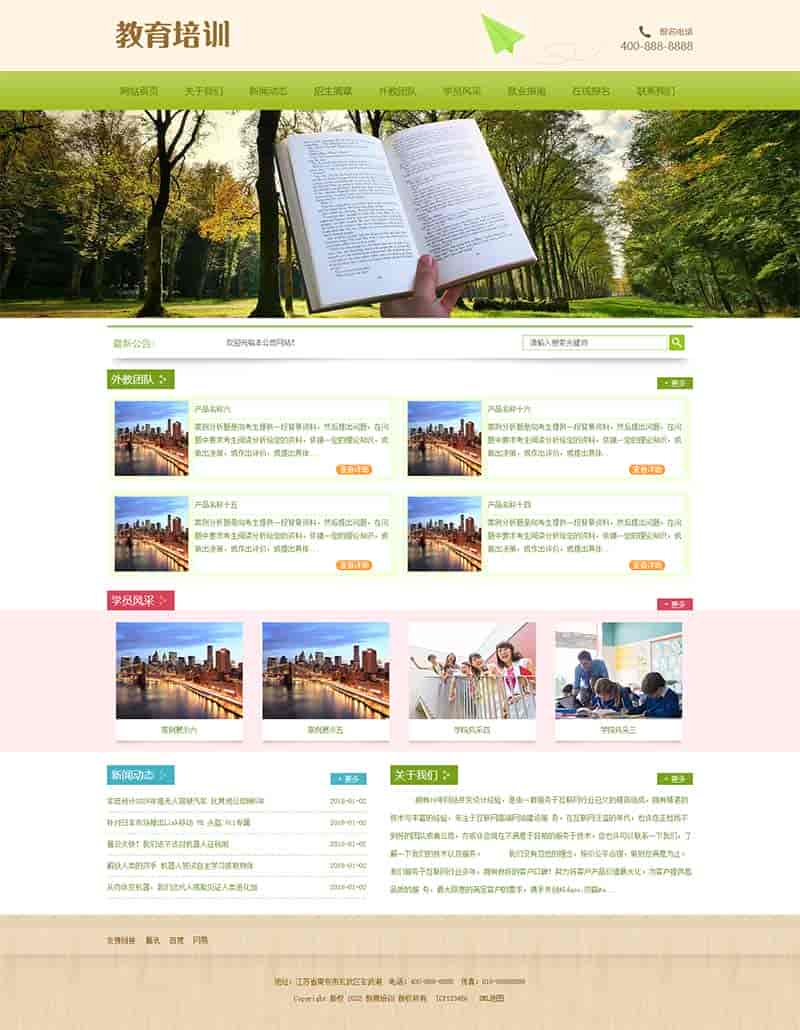(PC+WAP)pbootcms中小学教育培训机构网站模板 绿色小学学校网站源码下载PbootCMS内核开发的网站模板,该模板适教育培训机构网站、小学学校网站等企业,当然其他行业也可以做,只需要把文字图片换成其他行业的即可;自适应,同一个后台,数据即时同步,简单适用!附带测试数据!友好的seo,所有页面均都能完全自定义标题/关键词/描述,PHP程序,安全、稳定、快速;用低成本获取源源不断订单!后台:域名/admin.php