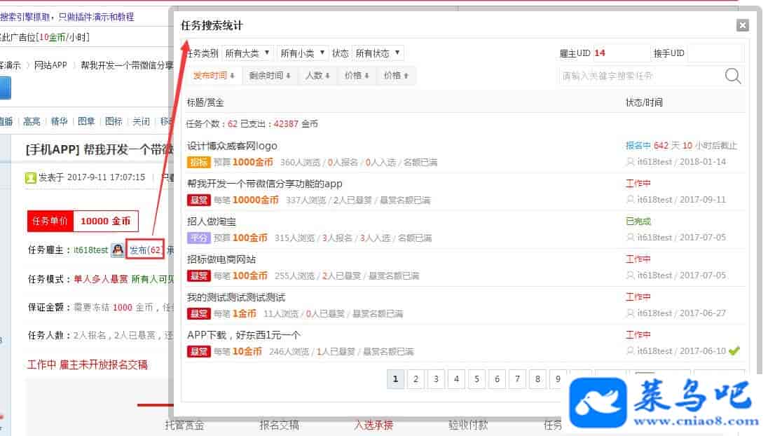 7、有强大的统计功能,任务双方用户名旁边都发布与承接统计数,点统计数可以直接看数据