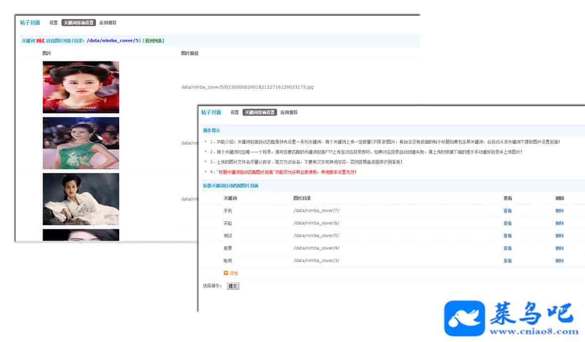 3、支持关键词封面库自动匹配封面:后台设置一系列关键词,再为每个关键词添加一个或多个图片,前台无封面的帖子会根据标题关键词自动匹配设置封面;