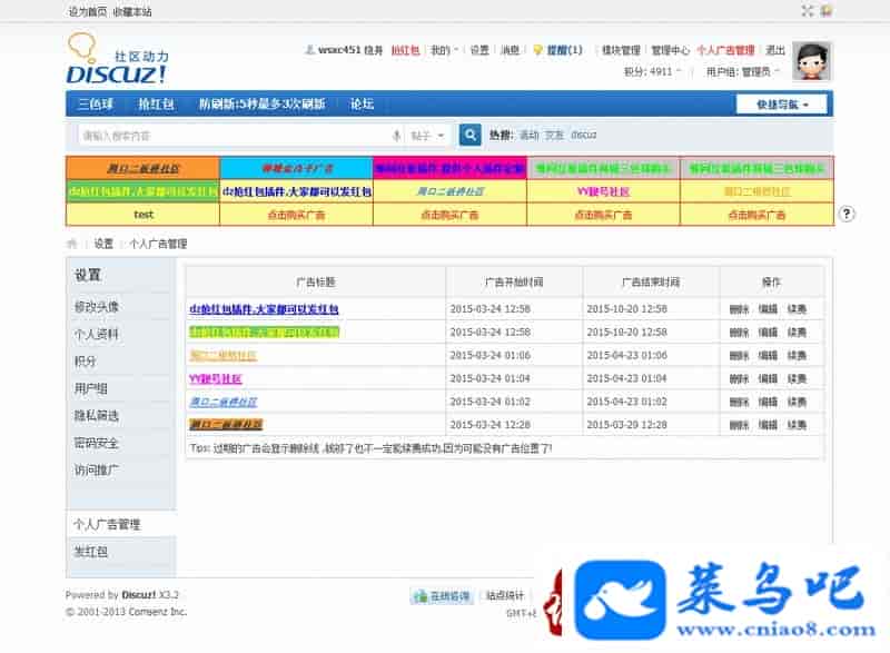用户前台可以点击购买广告位,购买广告位置.广告内容包括:标题,描述,链接,文字样式,购买天数.