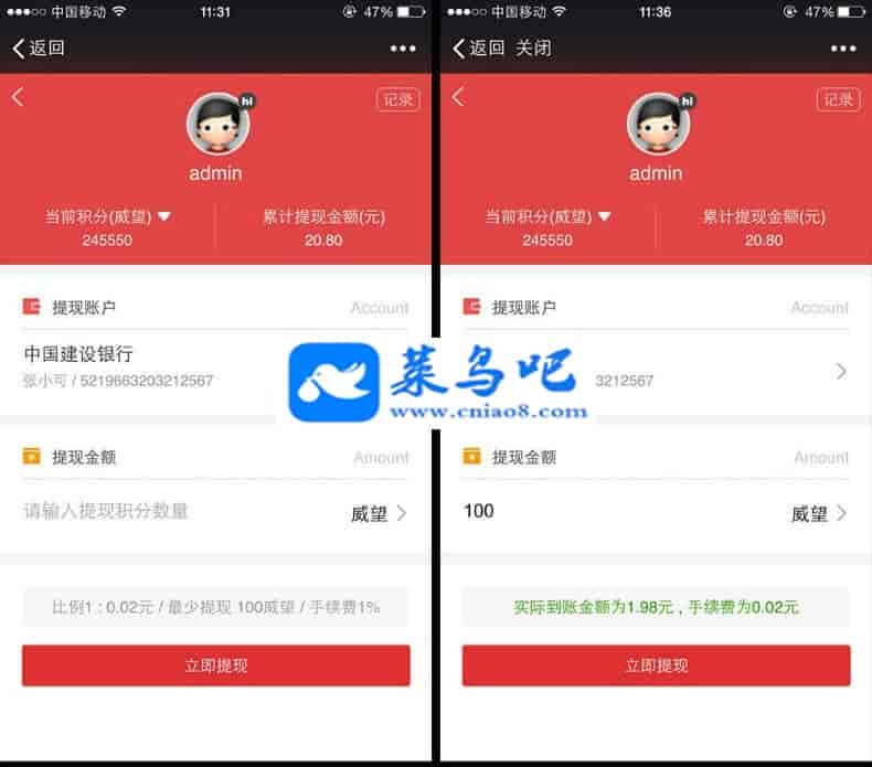 4,支持各个积分独立设置,独立设置比例,独立设置最少提现最多提现额度。