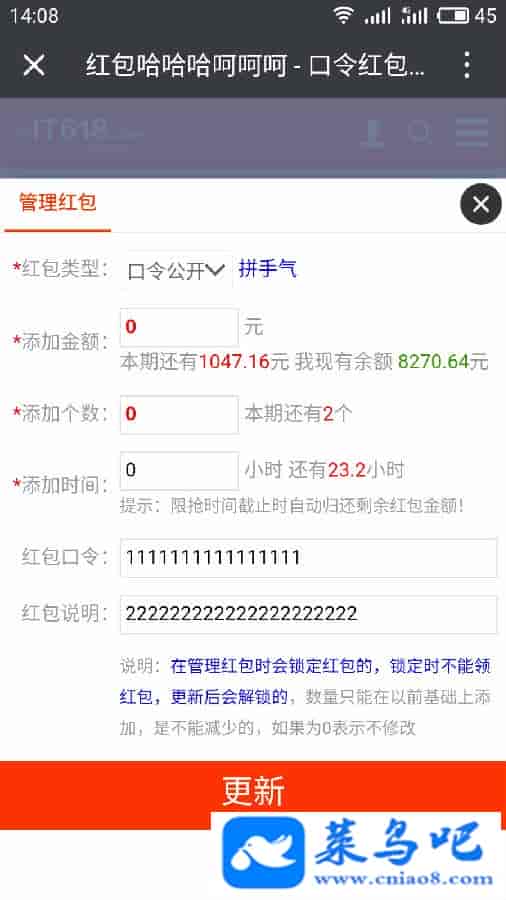 红包还可以修改,修改时会锁定红包,并且数量方面只能添加,为0时表示不修改数量,口令和说明都可以修改,更方便推广帖子,修改完自动解锁红包