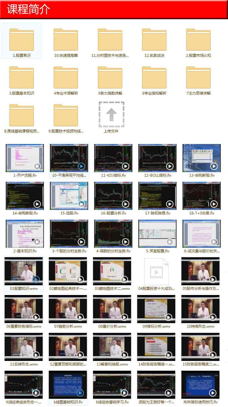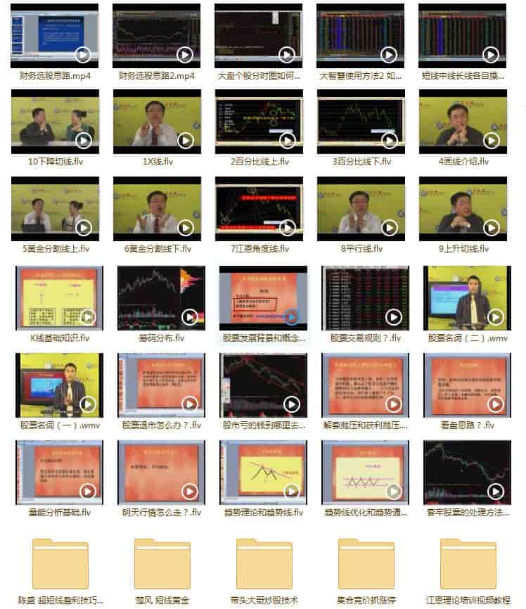 这是一套很全的股票入门教程,有股票常识、股票市场认知、股票基本知识、专业术语解析、各大指数详情、专业指标解析、主力思维详解、画线基础课程视频教程、股票技术视频均线教程、快速提高篇、分时技术与追涨停技术等内容。教程大小:36.2 GB
