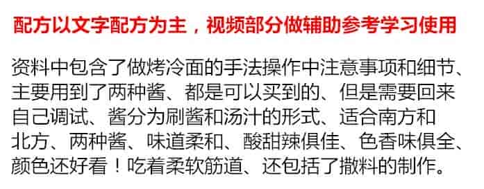 做烤冷面的手法操作中注意事项和细节、主要用到了两种酱、都是可以买到的、但是需要回来自己调试、酱分为刷酱和汤汁的形式、适合南方和北方、两种酱、味道柔和、酸甜辣俱佳、色香味俱全、颜色还好看!吃着柔软筋道、还包括了撒料的制作、锦上添花、资料中不懂的可以随时旺旺或者QQ联系我!