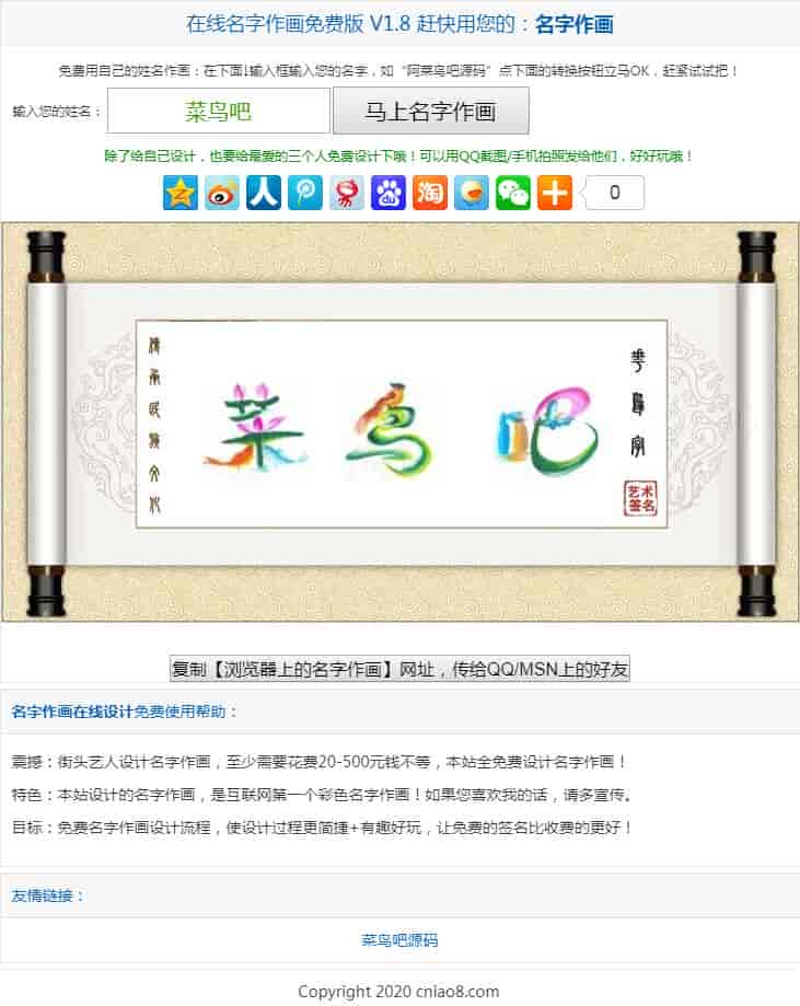 在线花鸟字个性签名制作网站源码,可以实现病毒式营销,适合做任何项目推广,制作3次以后(次数可以自己设置),必须分享到空间或者论坛,贴吧才能再次制作,可以实现病毒式营销。操作简单,不需要数据库,简单修改直接上传就可以了,需要技术支持请留言。